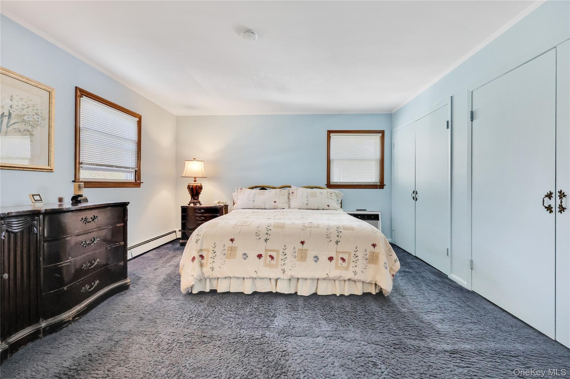 - Bedroom with carpet floors, multiple closets, and a baseboard heating unit
