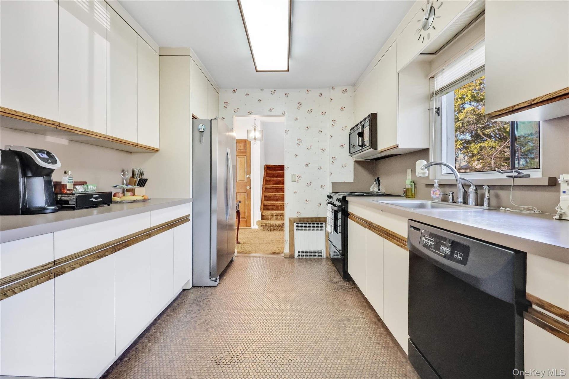 - Kitchen with black appliances, light countertops, and white cabinetry