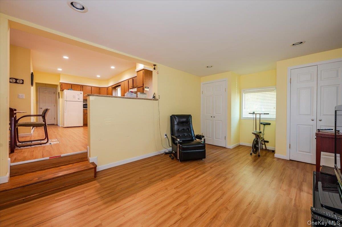 - Sitting room with recessed lighting, light wood-style floors, a wall mounted AC, and a baseboard radiator