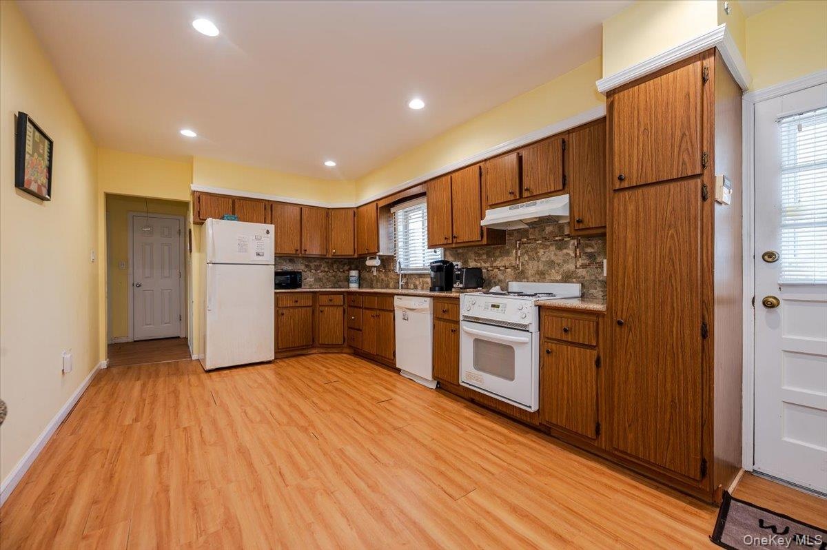 - Kitchen with white appliances, light wood-type flooring, backsplash, under cabinet range hood, and brown cabinets