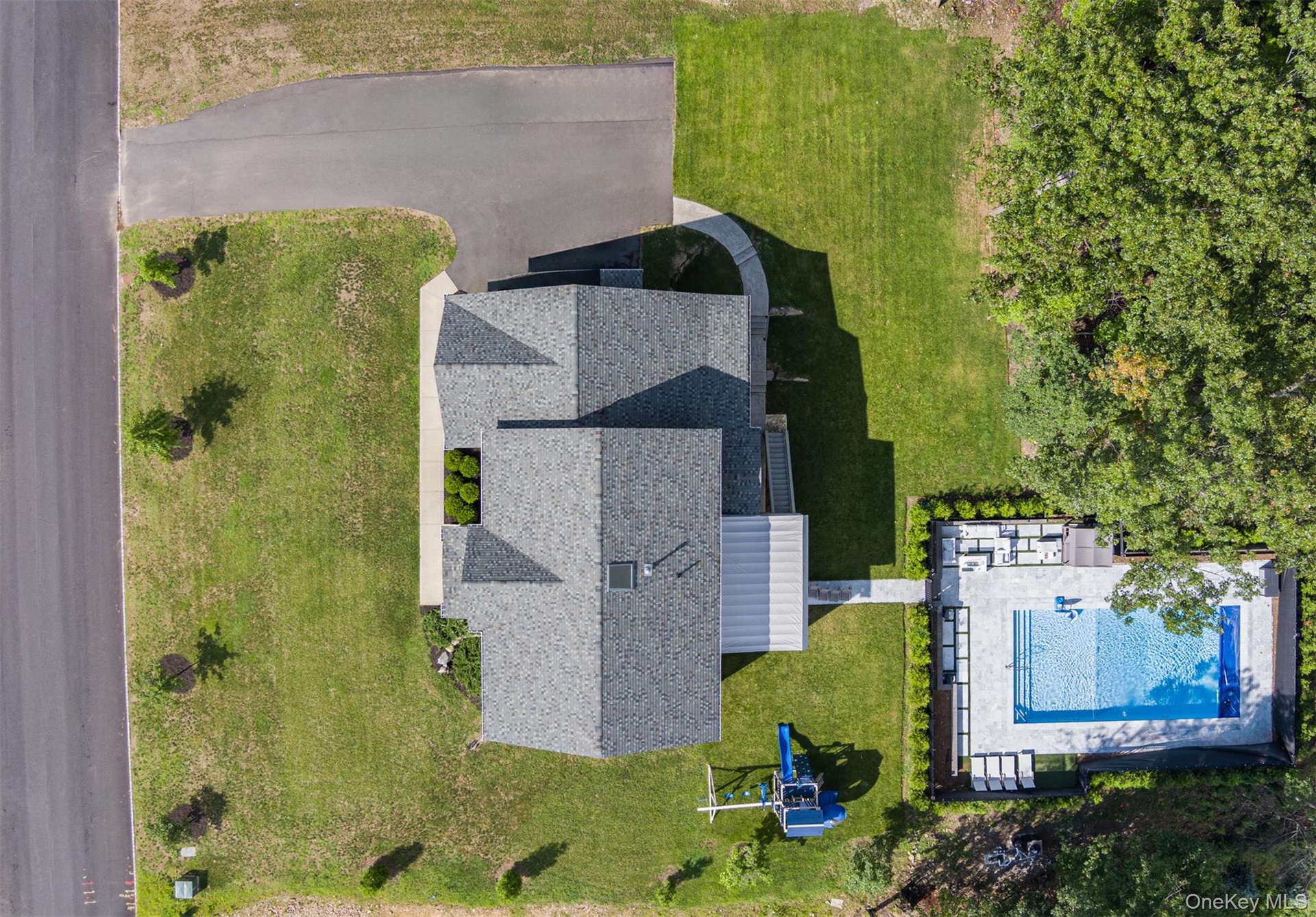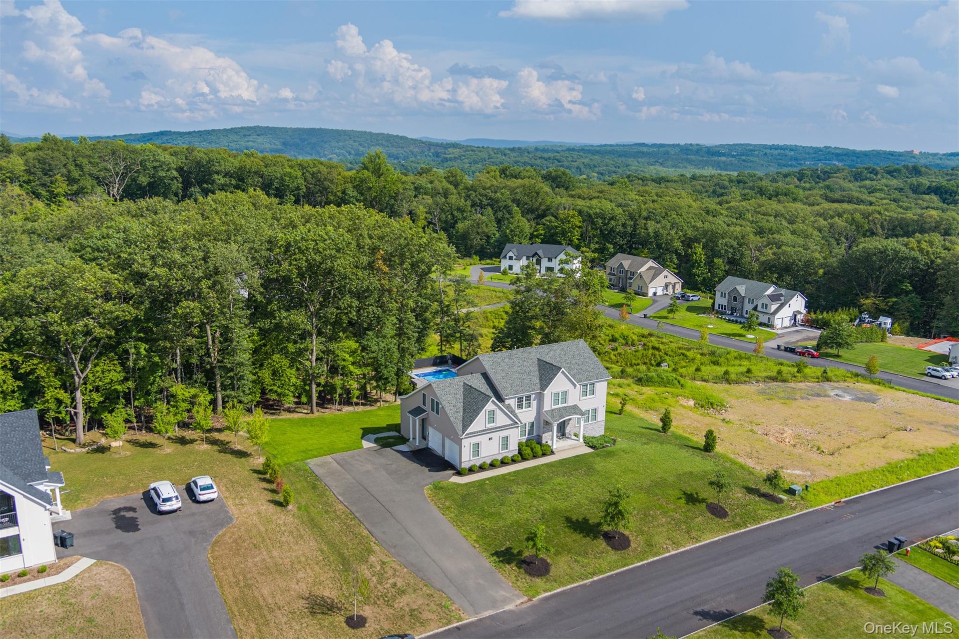 - Aerial view of property and surrounding area featuring a heavily wooded area and a pool area