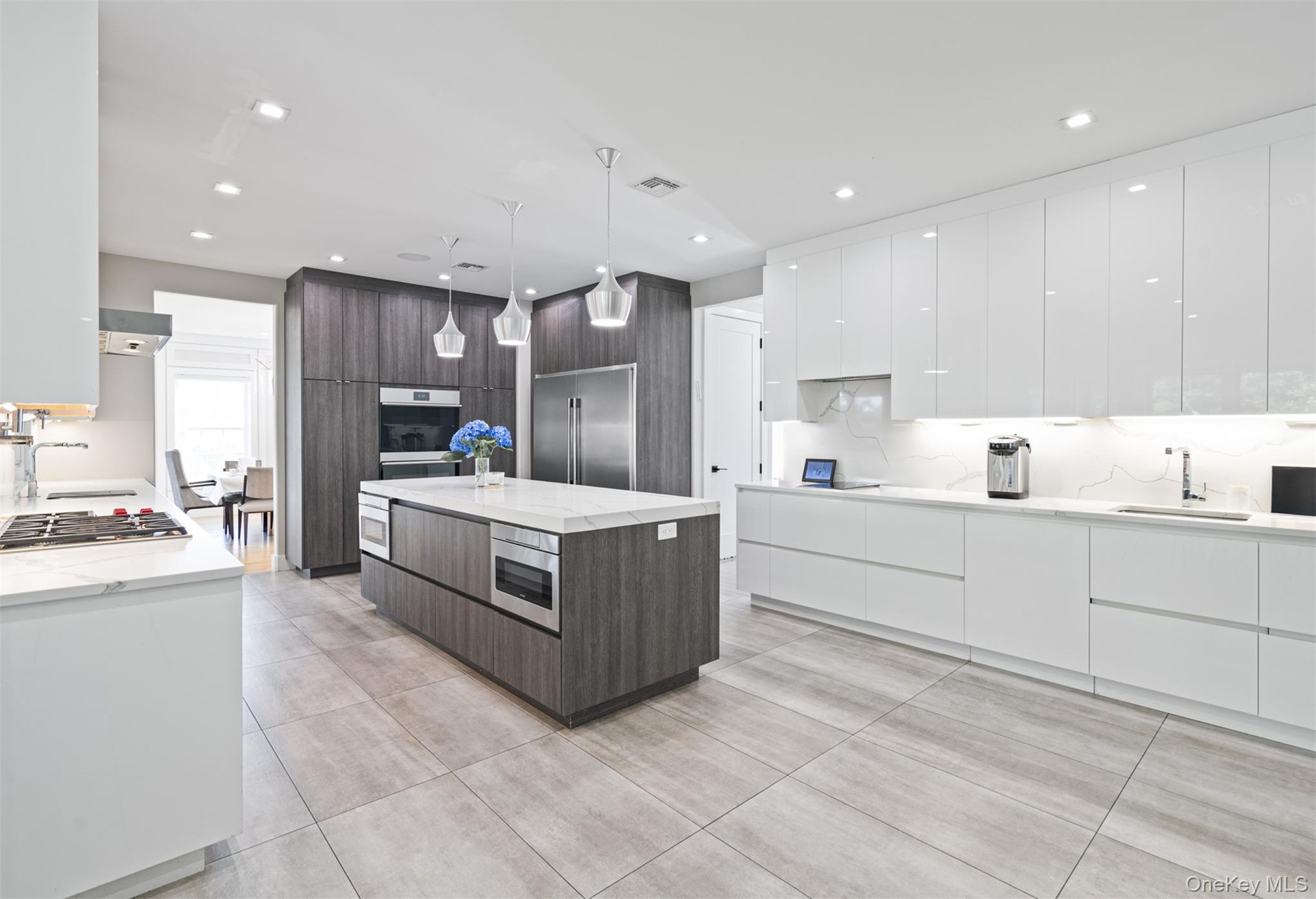 - Kitchen featuring modern cabinets, white cabinetry, light stone counters, stainless steel appliances, and recessed lighting