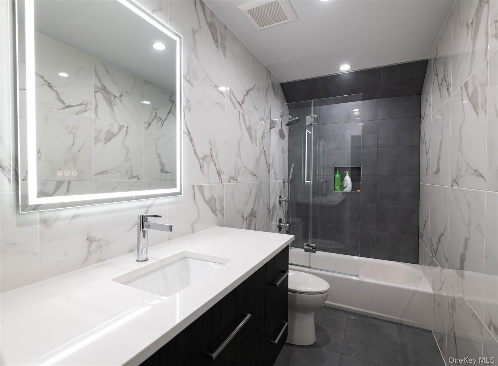 - Full bath featuring vanity, shower combination, dark tile patterned floors, tile walls, and recessed lighting