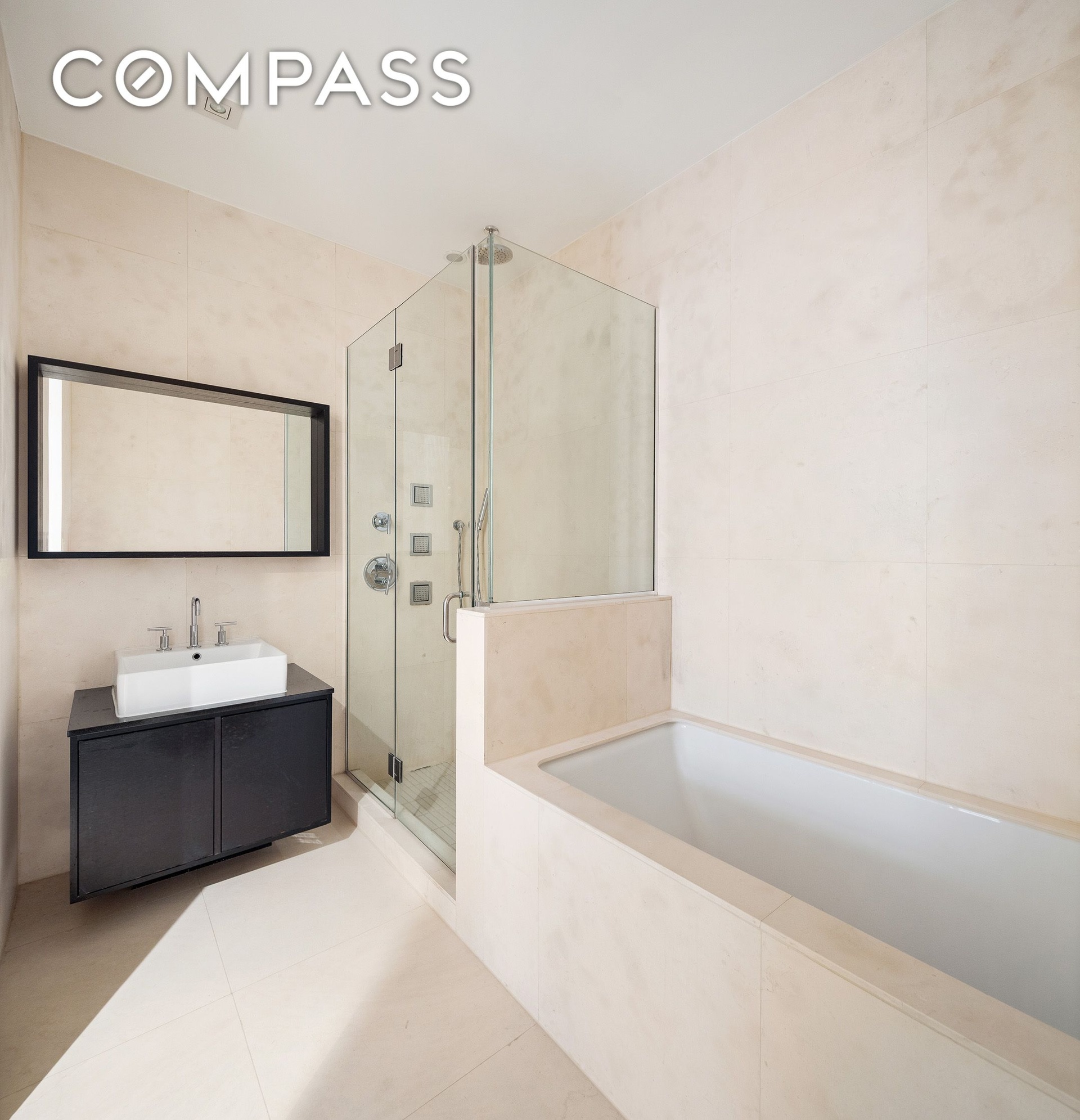 The desirable split-bedroom layout begins with a serene primary suite featuring a king-size bedroom. An oversized walk-in closet/dressing room leads to the en suite primary bathroom, where a soaking tub and shower are surrounded by floor-to-ceiling tile. Off the living room, pocket doors reveal a huge secondary suite with a private bathroom and two closets, including a walk-in. An in-unit washer-dryer and central HVAC add comfort and convenience to this fantastic Flatiron sanctuary.