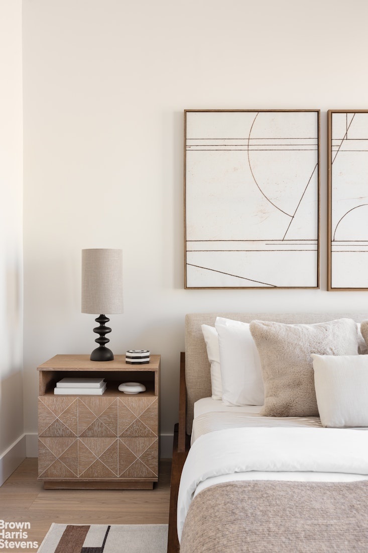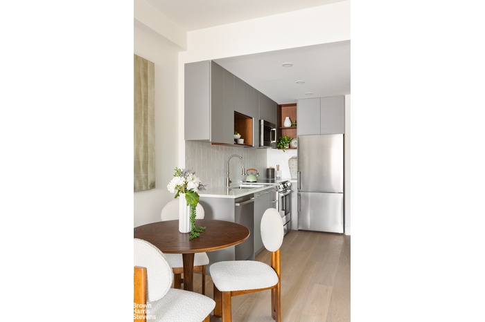 Residence 3C's 1 bedroom, 1 bathroom layout exemplifies the pinnacle of luxury living. The interiors are adorned with rich white oak engineered wood floors, creating a warm and inviting atmosphere. The spacious and open floor plan allows for effortless entertaining and comfortable living leading out to a private balcony. The state-of-the-art kitchen is a chef's dream, featuring sleek white countertops and a blend of custom painted wood shaker cabinetry and elegant open shelving that enhance the clean, modern aesthetic. High-end appliances by Bosch ensure every meal is prepared to perfection.