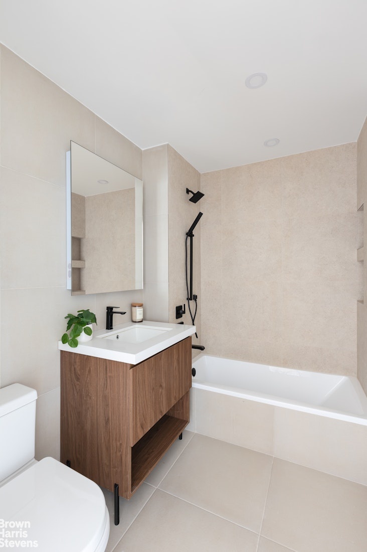 The luxurious bathroom is designed as a private sanctuary, boasting a modern wood vanity, sleek black Moen fixtures and a contemporary lighted mirror. The spacious bedroom features large sunny windows and a large closet.
