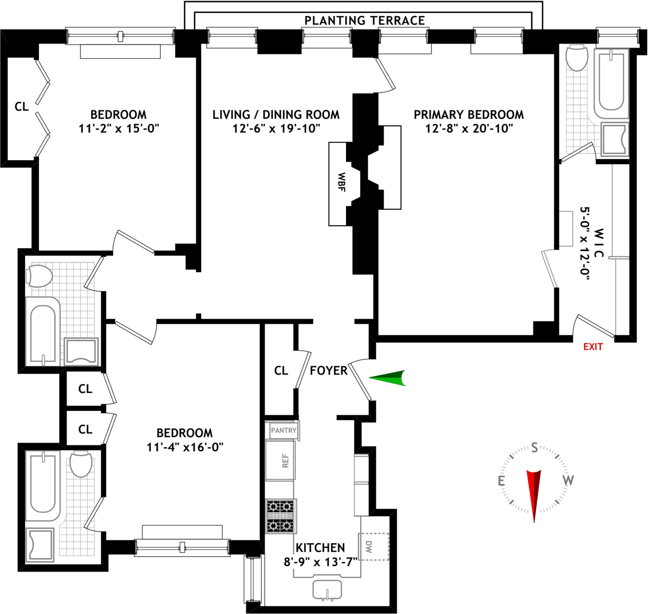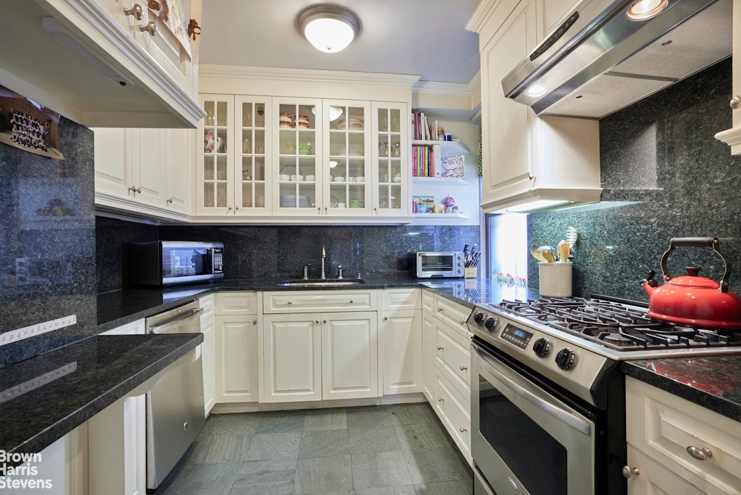 Bathed in natural light and brimming with timeless elegance, this high-floor, meticulously renovated 3-bedroom, 3-bath residence seamlessly blends classic pre-war charm with modern sophistication. Set within a distinguished full-service cooperative, this expansive home showcases exquisite architectural details, including beamed ceilings, graceful crown moldings, and hardwood floors throughout. A welcoming entry foyer leads into a formal living room, anchored by a stately wood-burning fireplace. Sunlight streams through expansive south-facing windows, framing picturesque views of your private planting terrace and the sweeping city skyline beyond. The oversized primary suite is a serene sanctuary, featuring a second fireplace, a custom-designed walk-in closet, and an en-suite bath adorned with classic subway tile, a pedestal sink, and a deep soaking tub. The thoughtfully renovated, windowed kitchen boasts slate flooring, granite countertops, under-cabinet lighting, and elegant glass-front cabinetry. Premium stainless-steel appliances include a Kitchen Aid refrigerator, Bosch dishwasher, and Amana stove with a vented hood. Off the living room, a private hallway leads to two additional bedrooms, each offering generous closet space and two full baths. One bedroom is currently configured as a warm, inviting library with custom built-in bookcases and ample storage.