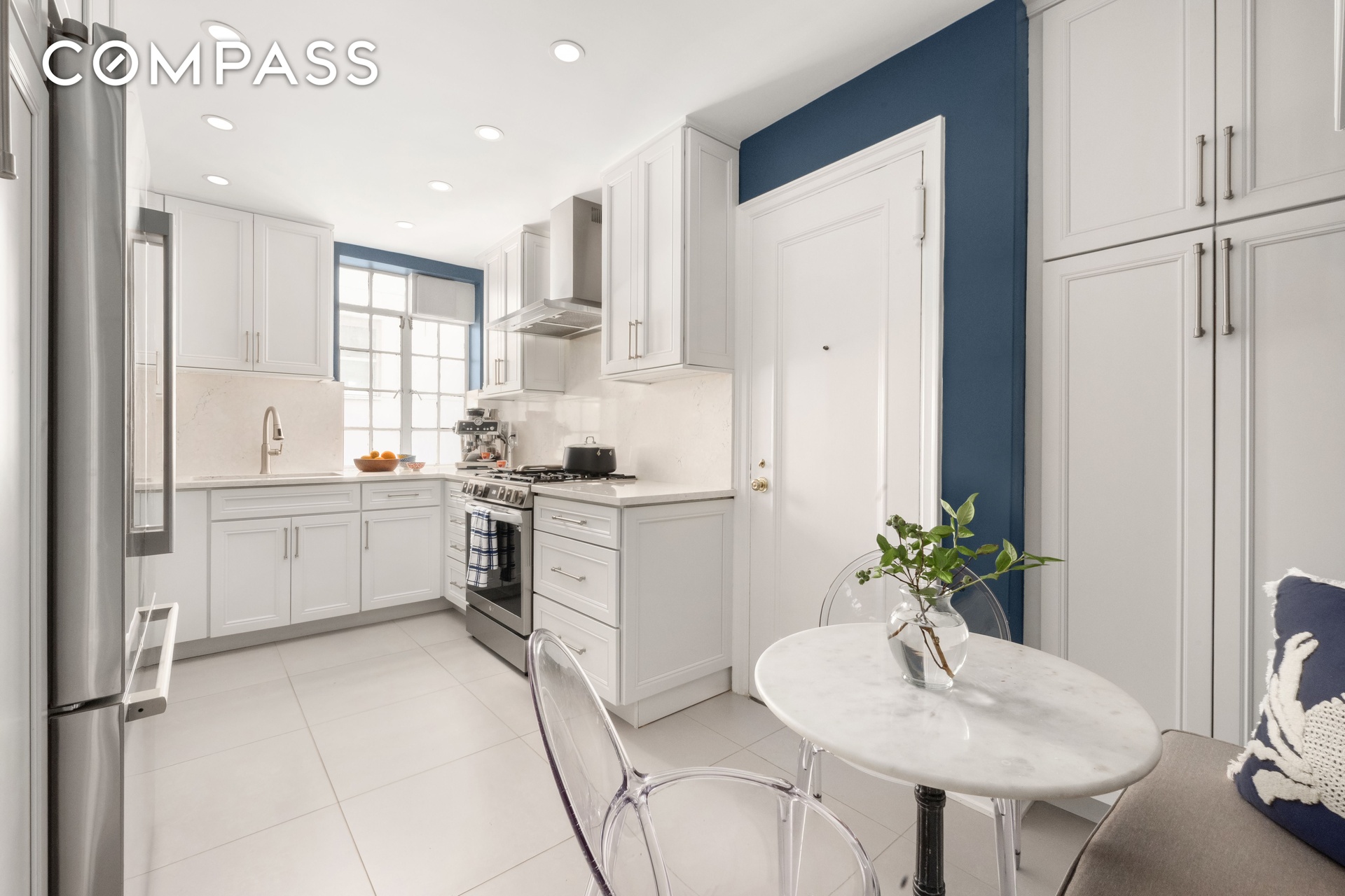 A well designed, renovated windowed eat-in kitchen is outfitted with real wood cabinets, quartz counters, a Bosch refrigerator, an LG stove and a Bosch dishwasher. There is even storage under the banquette.