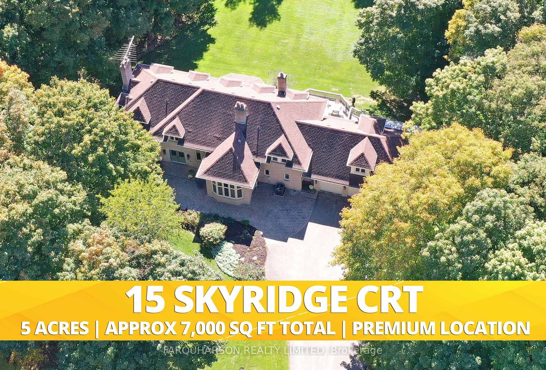15 Skyridge Crt Offering 5 Acres | Approximately 7,000 Sq Ft Total | Mature Forest | Stream | & a Premium Location. Just Minutes from Highway 404, Top-Rated Schools, the Bloomington GO Station, Golf Courses, and the Amenities of Aurora, Markham, and Richmond Hill. The Property offers a Canopy of Mature Maple Hardwood Forest with Trails and Rolling Topography. Nestled on a Private Cul-de-sac of just 11 Executive Homes. Inside, a Grand Foyer Opens to a Formal Living Room with a Cozy Fireplace and Serene Views. The Private Library offers Built-in Shelving and a Peaceful Retreat. The Gourmet Kitchen Features Granite Counters, a Spacious eat-in Area, Forest Views, and a Walk-out to the Elevated Deck. The Dining Room Impresses with Soaring Double Height Ceilings and a Striking Stone Fireplace. Upstairs, the Primary Wing offers a Fireplace, Dual Ensuites, and Custom Closets. A Private Guest Suite above the Garage Includes its own 3-piece Ensuite - Perfect for In-laws/Nanny. The Newly Renovated Lower Level offers Full-size Windows, Multiple walk-outs, a Custom Media Room with Stone Fireplace, and an Open-Concept Entertainment Space with Bar and Dining Areas (Potential for additional Lower-Level Kitchen and suite with Approvals). A Spa-Inspired 3-piece bath Completes this Level. Outside, explore over 215,000 sq. ft. of Natural Beauty - a Premium Location offering a place to Breathe, Connect, and Create lasting memories.