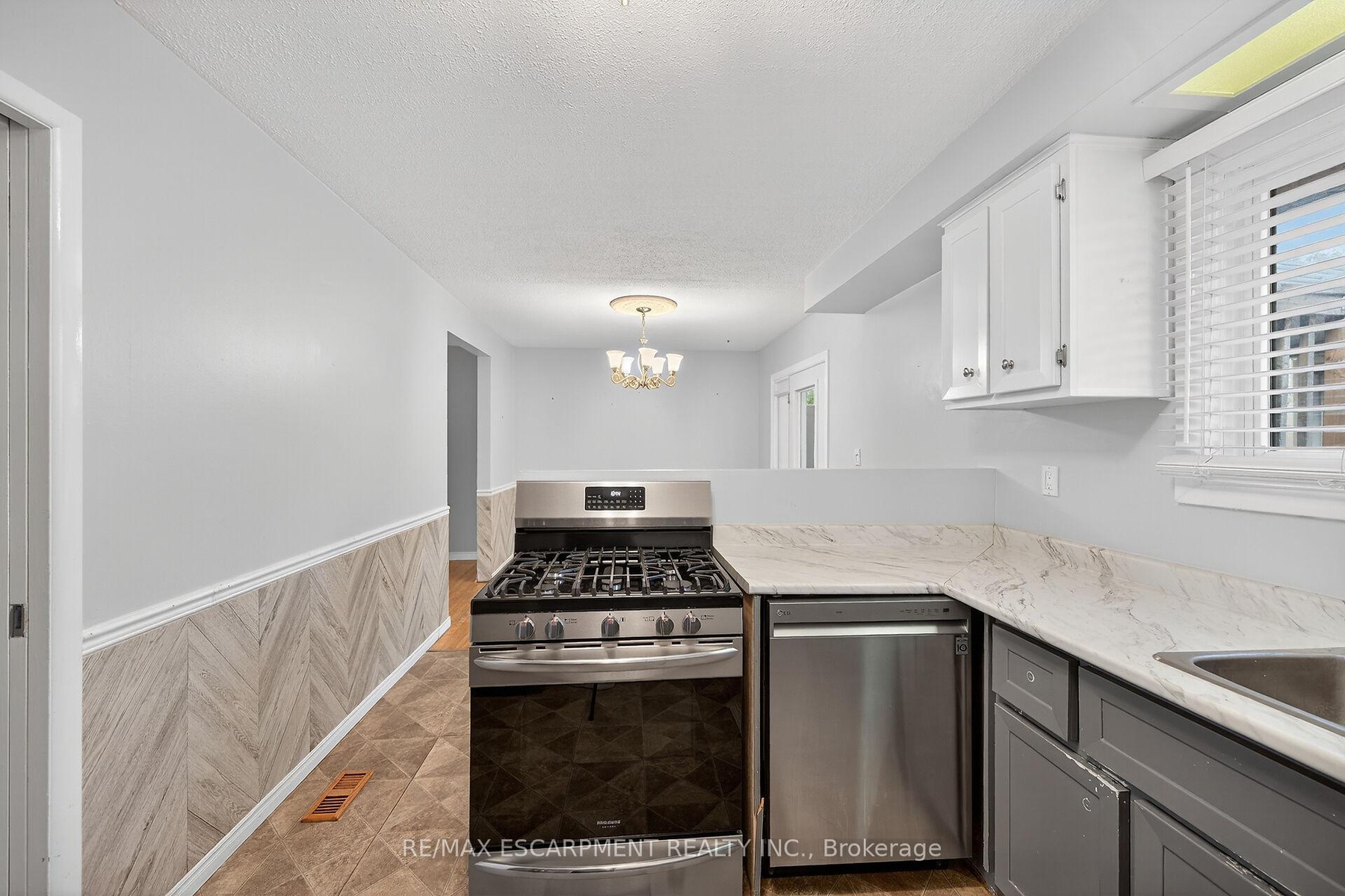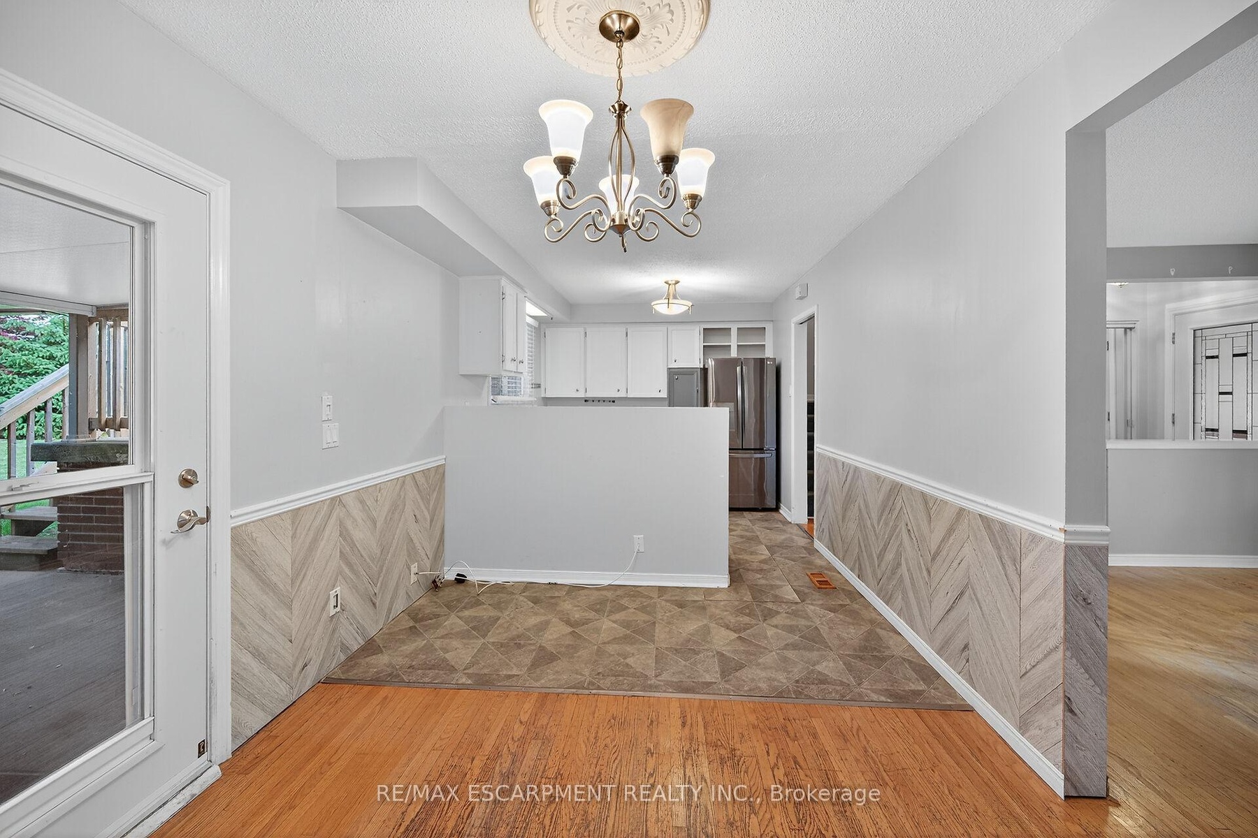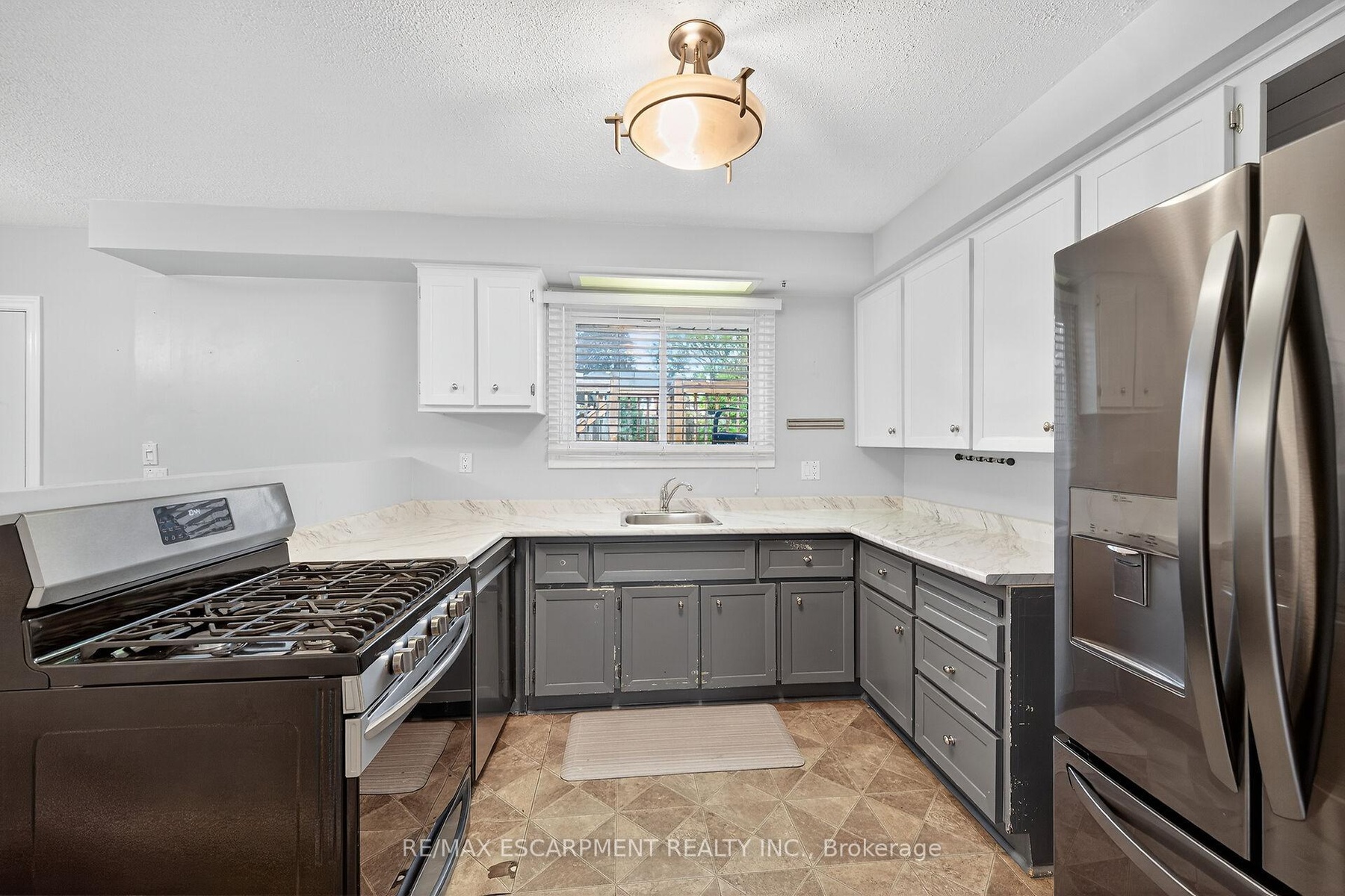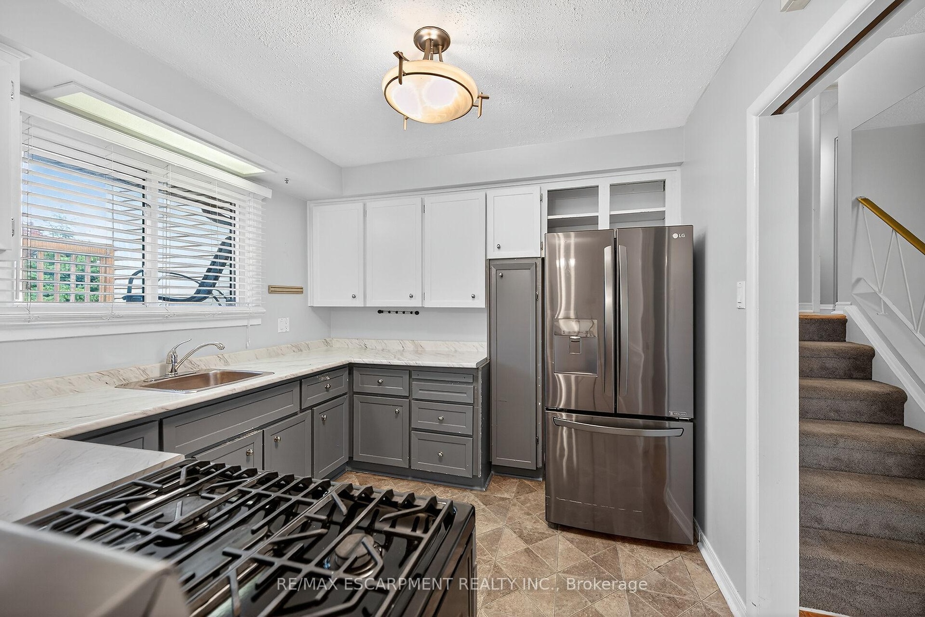 Warm & inviting fully finished 3 bedroom side split with two gas fireplaces in desirable family friendly east mountain location featuring handy oversized 14'1 x 23'11 garage with hydro. Hardwood flooring throughout living room, dining room, hallway & all bedrooms. Main floor offers bright living room with gas fireplace with oak surround, dining room with access to rear yard & kitchen with stainless steel appliances. Second floor features three good sized carpet-free bedrooms & updated bath with accessible jetted tub (2019). Large lower level rec room showcases corner gas fireplace with lovely custom oak surround & newer carpeting (2025). Central air (2023). 100 amps on breakers (2025). Eaves with gutter guards. Fully fenced lot with 6'6 x 26'10 covered concrete patio & 9'9 x 9'4 deck. Quick & easy access to Linc. Close to all amenities. Only minutes to Limeridge Mall.