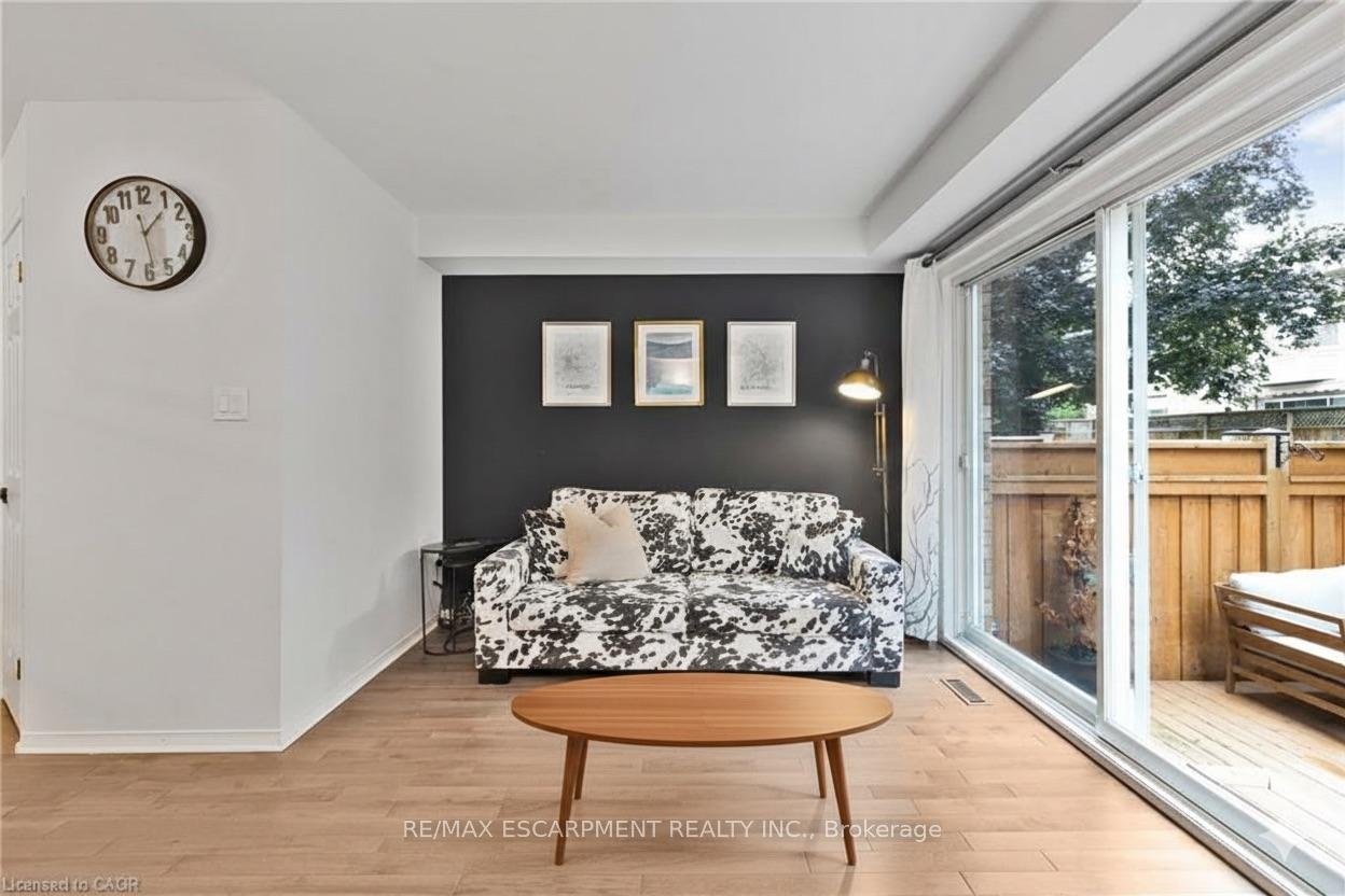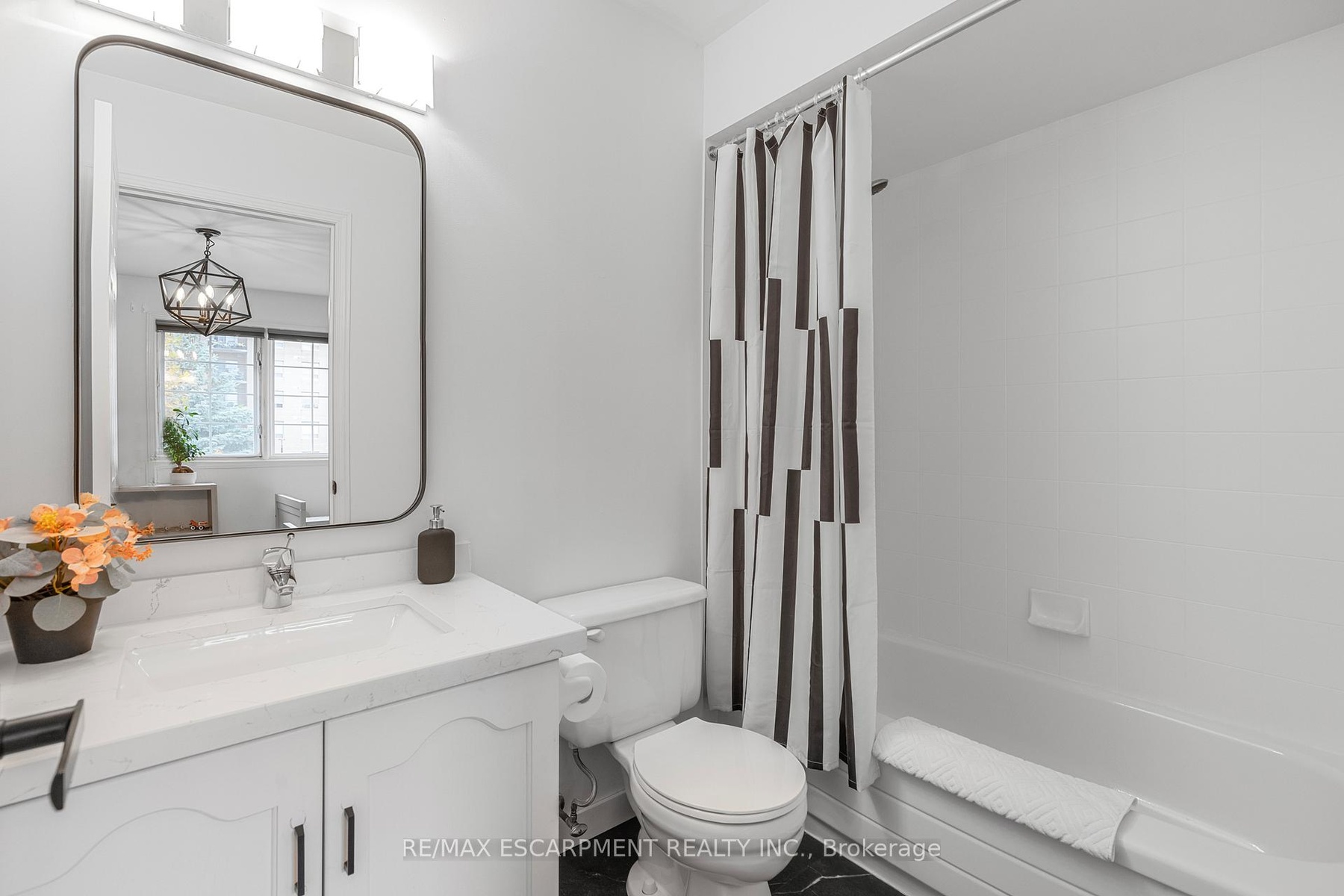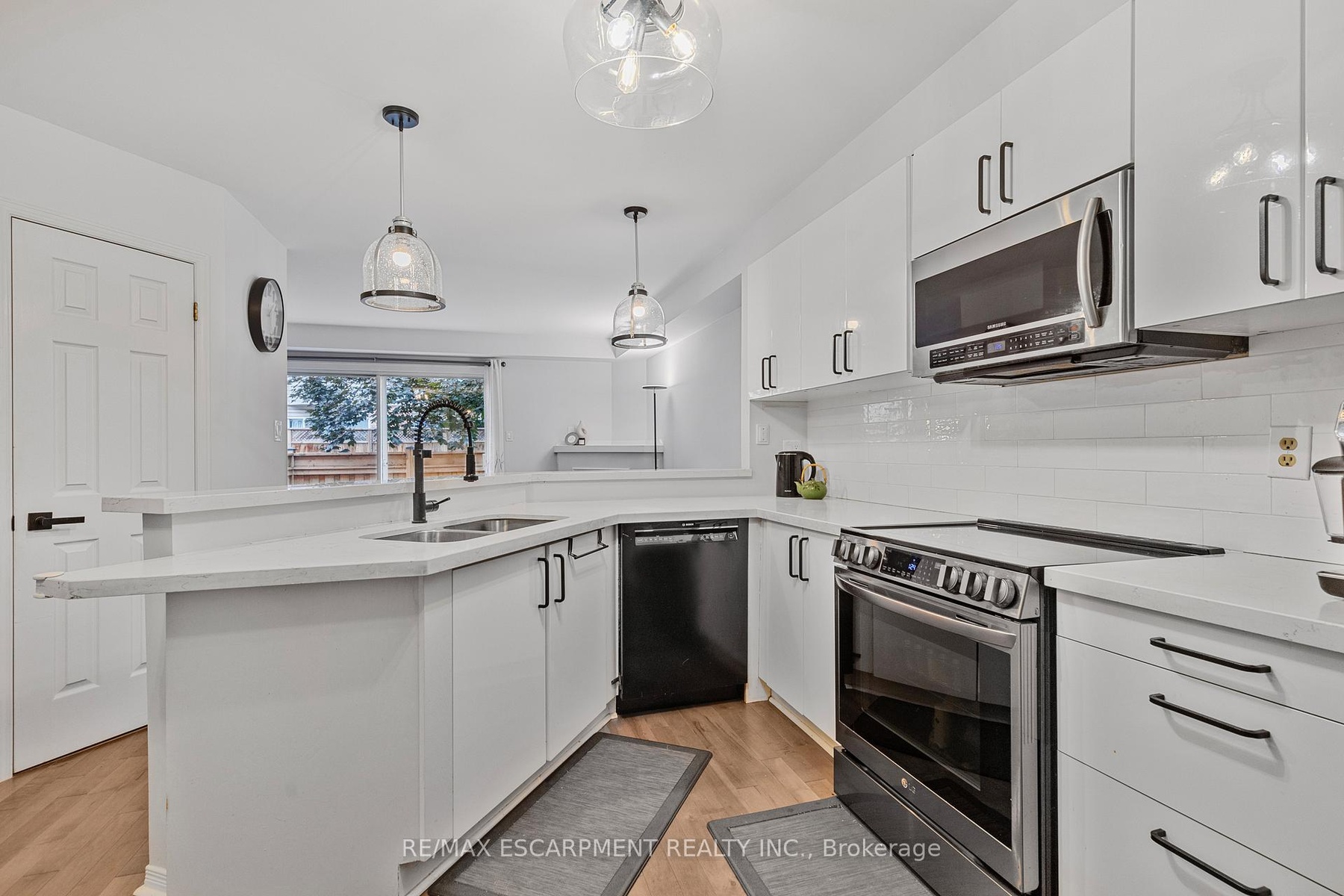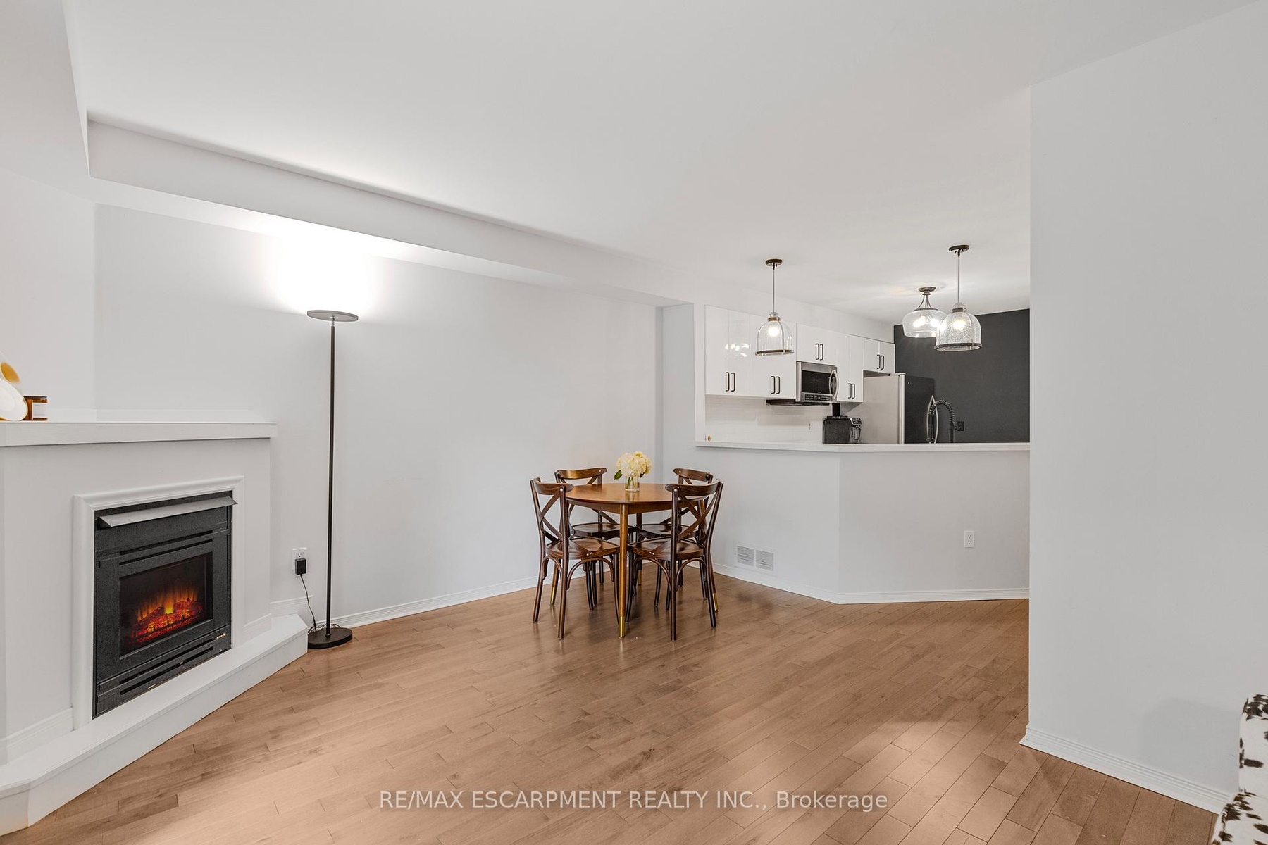 Welcome to Headon Forest living. This updated townhome offers a bright and functional layout in one of Burlington's most convenient neighbourhoods. Both bedrooms are generously sized and include private ensuites: the primary (2022) features a spa-like 4-piece bath with porcelain tile, soaker tub, and separate shower, while the second was refreshed in 2025 with updated flooring and paint. The main level combines an open concept kitchen and living area, ideal for everyday living. The kitchen, updated with quartz counters and cabinetry (2022), flows into the dining/living room with a gas fireplace and walkout to a private deck. Hardwood flooring extends throughout both the main and upper levels. The finished lower level provides flexible space for a family room, office, or gym. Other recent updates include main level hardwood flooring (2021), range (2021), washer (2021), attic insulation top-up (2024), and A/C (2025). Set in a family-friendly community, this move-in ready home is within walking distance to schools and a forested park, with nearby shopping and easy highway access. A well-cared-for home in a great location-ready to welcome its next owners.