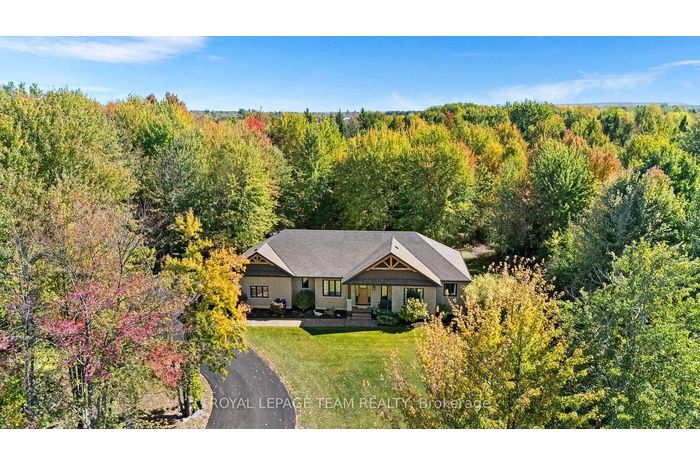 This custom built bungalow is nestled on a private 4 acres with a park like setting featuring numerous species of newly planted vegetation.(list available) Landscaped with walking paths, gardens to be proud of and a privacy to be enjoyed. The open backyard offers a spacious deck on summer days, the fire pit area on cooler evenings or the covered screened gazebo for entertaining or a morning coffee. The interior open concept main level includes, stately cathedral ceilings in the living room with a gas fireplace. The hardwood flooring extends throughout the Living, Dining, Kitchen and hallways. The gourmet kitchen w/granite counter tops, commercial style hood fan, gas range, pantry and Stainless Steel appliances leads to a formal dining area. This main level is a wonderful place to entertain with family and friends. The Primary bedroom has a recently renovated ensuite bath, walk in closet area. The two ample sized secondary bedrooms and has easy access the main 4 piece bath. The extensive 3 car garage has inside access leading to well laid out mudroom and laundry. The professionally finished lower level offers recreational space, 4th bedroom, full 3 piece bath, office area and major storage space. The fabulous home is located in the exclusive enclave of home in West Lake Estates and is only minutes to Kanata, Carp and Stittsville. This curb appeal starts at the elegant front door, throughout the entire interior to the meticulously landscaped acreage. Come visit this home today. 24 hrs irrev on offers as per form 244