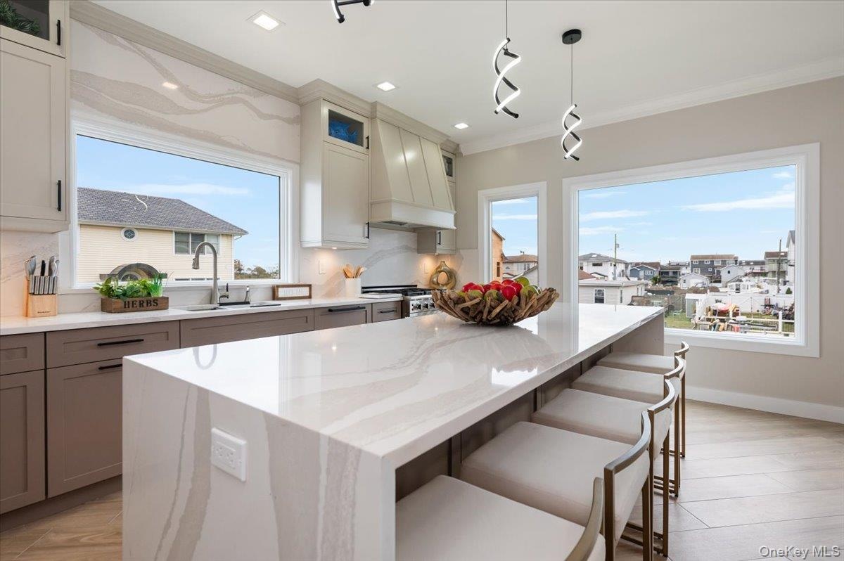 Welcome to this exquisite newly built Colonial by OZ General Contracting, a stunning three-level waterfront home offering 90 ft of brand-new PVC bulkhead with direct canal access and just one block from the Great South Bay. Built to FEMA and town codes, this property combines peace of mind with exceptional craftsmanship. The first level features an 8 ft ceiling, a spacious four-car tandem garage, a large unfinished bonus room, and a utility room. On the main level (2nd floor), oversized Andersen 400 Series windows flood the open floor plan with natural light, while elegant porcelain tile floors add warmth and style. The heart of the home is the custom chef’s kitchen with maple cabinetry handcrafted by OZ General Contracting, backed by a 3-year warranty, crown molding to the ceiling, transom glass display cabinets, Cambria quartz countertops throughout, and a large 9 ft x 3 ft island with a stunning waterfall edge. Let’s add some dramatic lighting with under-cabinet and toe-kick lighting to create the perfect ambiance. A large walk-in pantry with built-in shelving, cabinetry, sink, and countertop space offers the perfect spot for a coffee bar or prep station. The dining area comfortably accommodates a banquet-sized table and flows seamlessly into the spacious living room, which is perfect for relaxing and entertaining. The living room expands into an additional area that can be used for a bar, extra seating, or a possible home office. A full bathroom completes this level. The third floor features select oak wood floors, and the buyer has the option to choose their stain color for the floors, railings, and stairs. The serene primary suite includes tray ceilings, crown molding with uplighting, a luxurious en-suite bathroom, and a custom walk-in closet. All bathrooms feature Cambria quartz vanity tops with lighting under the vanities, creating a seamless and elegant finish throughout the home. Three additional bedrooms share a beautifully designed hall bath, and the laundry closet is conveniently located on this floor. Additional features include a new dock, sprinklers in the grass areas, fire sprinkler system on each floor, two Navien systems providing hot water on demand—the most efficient way to create hot water so you’ll never run out while showering—two-zone heat and CAC, 200-amp electric service, and over 100 hi-hats throughout. The whole house is foam insulated, making it highly energy efficient and allowing for lower utility bills. Whether you're enjoying stunning water views, entertaining in the open-concept living space, or docking your boat right in your backyard, this property offers an exceptional waterfront lifestyle and is truly a must-see. (NOTE-for GPS, use 3670 Somerset Dr, it's behind that house on S. Somerset Dr)