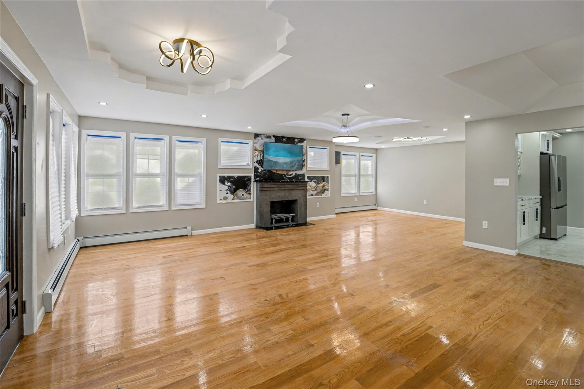 - Unfurnished living room with a raised ceiling, light wood finished floors, baseboard heating, a chandelier, and recessed lighting