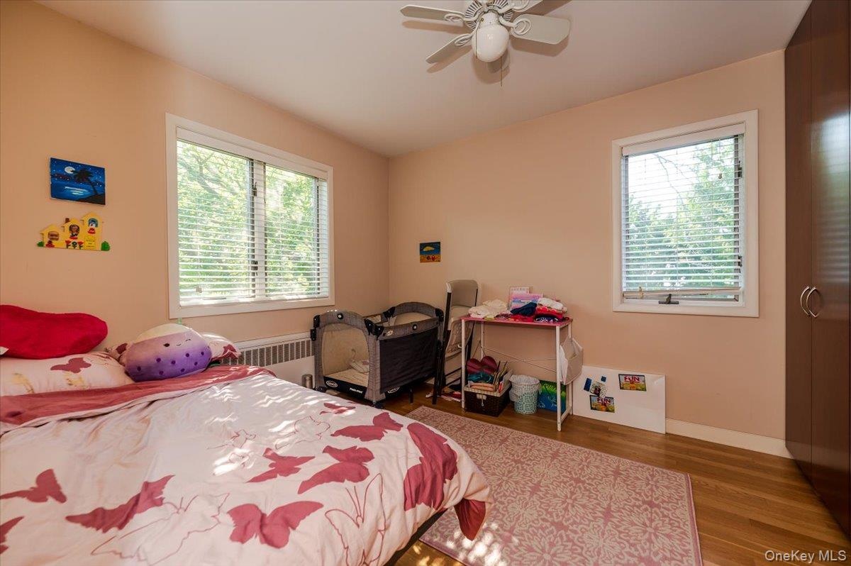 - Bedroom with multiple windows, wood finished floors, radiator, and a ceiling fan