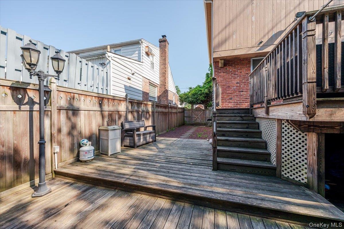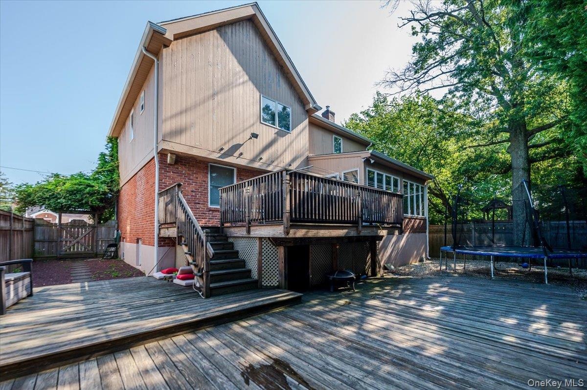 - Deck with a fenced backyard, a trampoline, stairs, and a gate