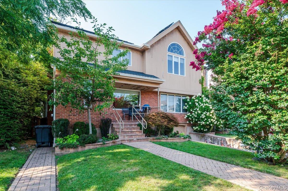 - Traditional-style house with a front lawn, brick siding, and stairs
