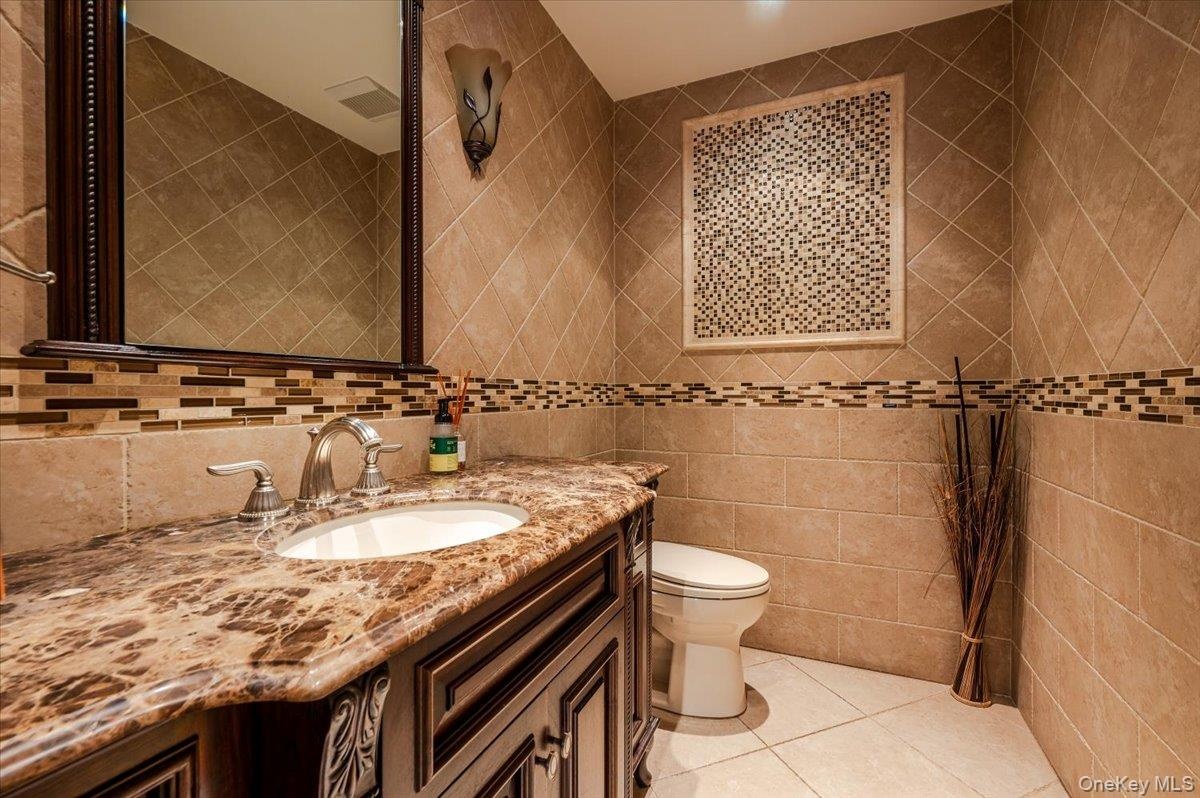 - Bathroom featuring tile walls, vanity, light tile patterned flooring, and decorative backsplash