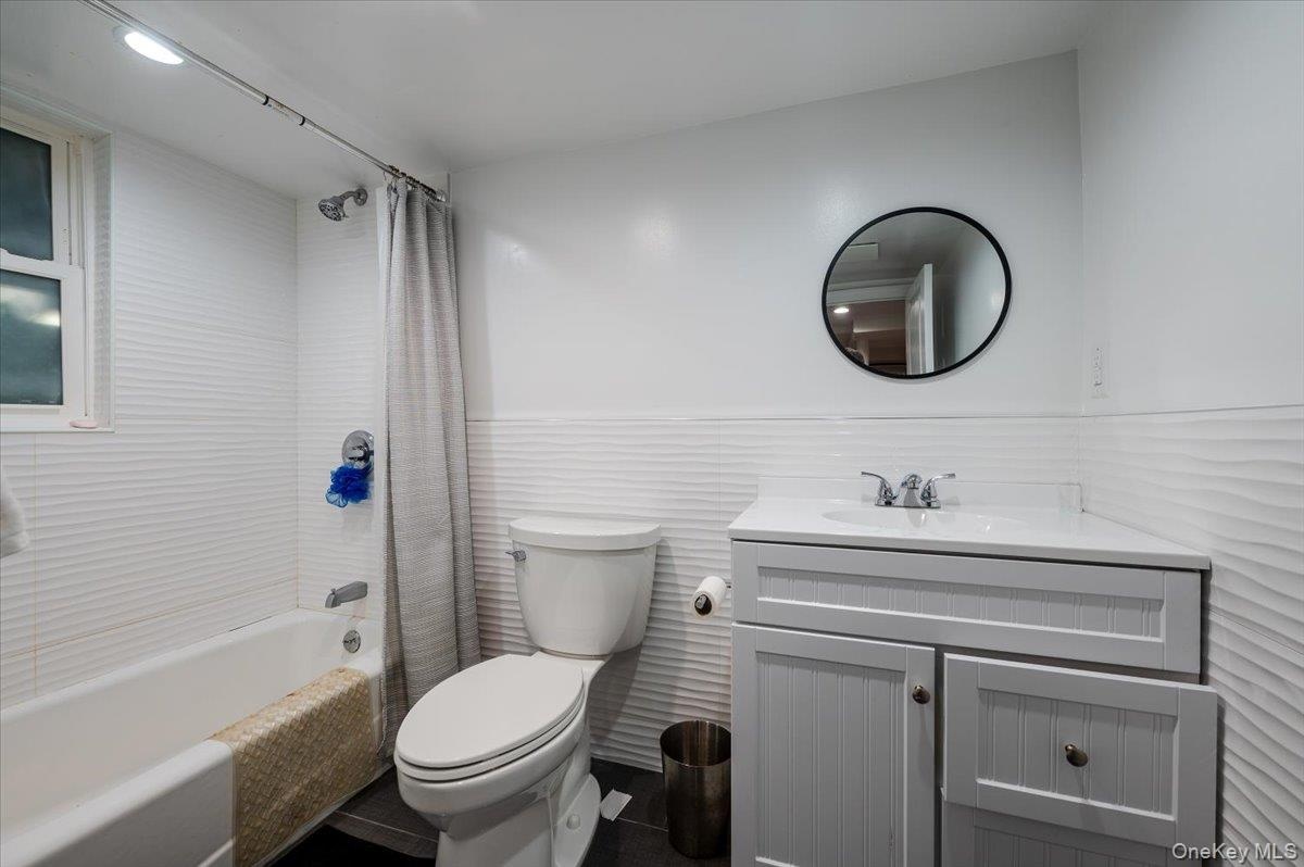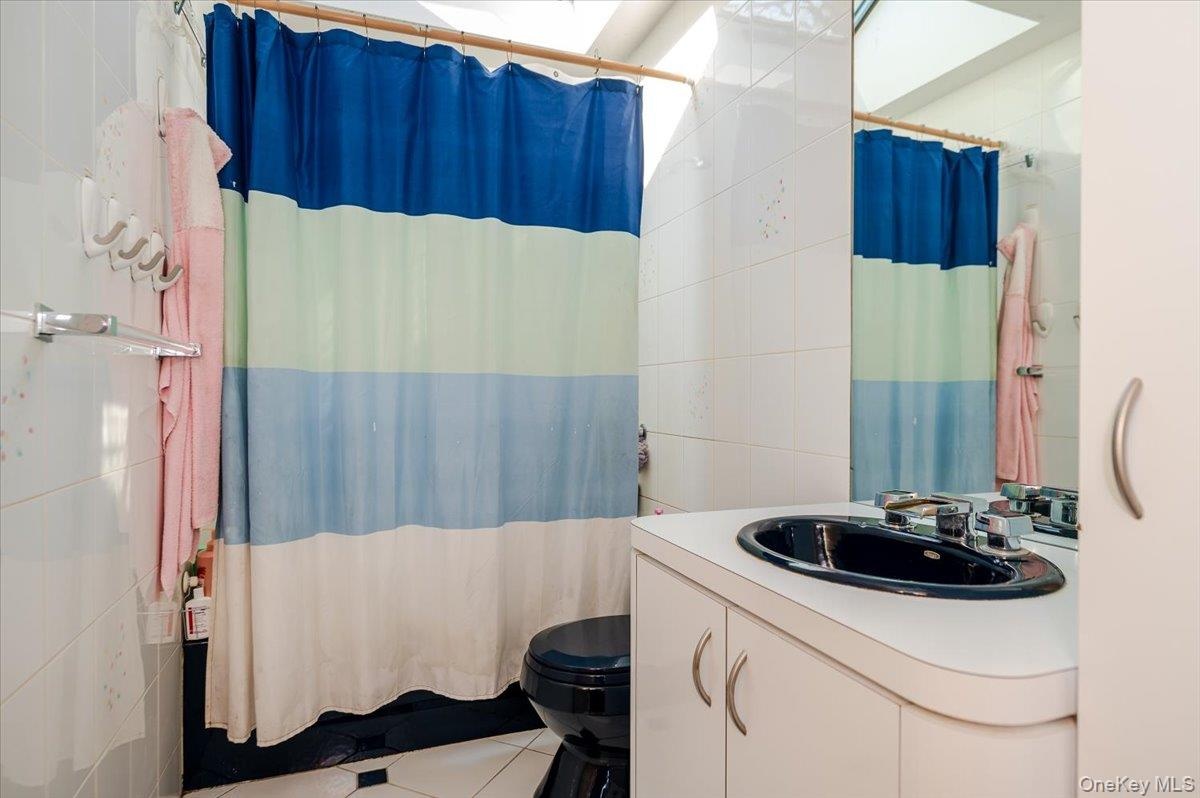 - Bathroom with shower / tub combo with curtain, vanity, and tile walls