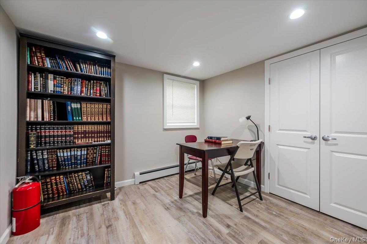 - Office space with light wood-style flooring, recessed lighting, and a baseboard heating unit