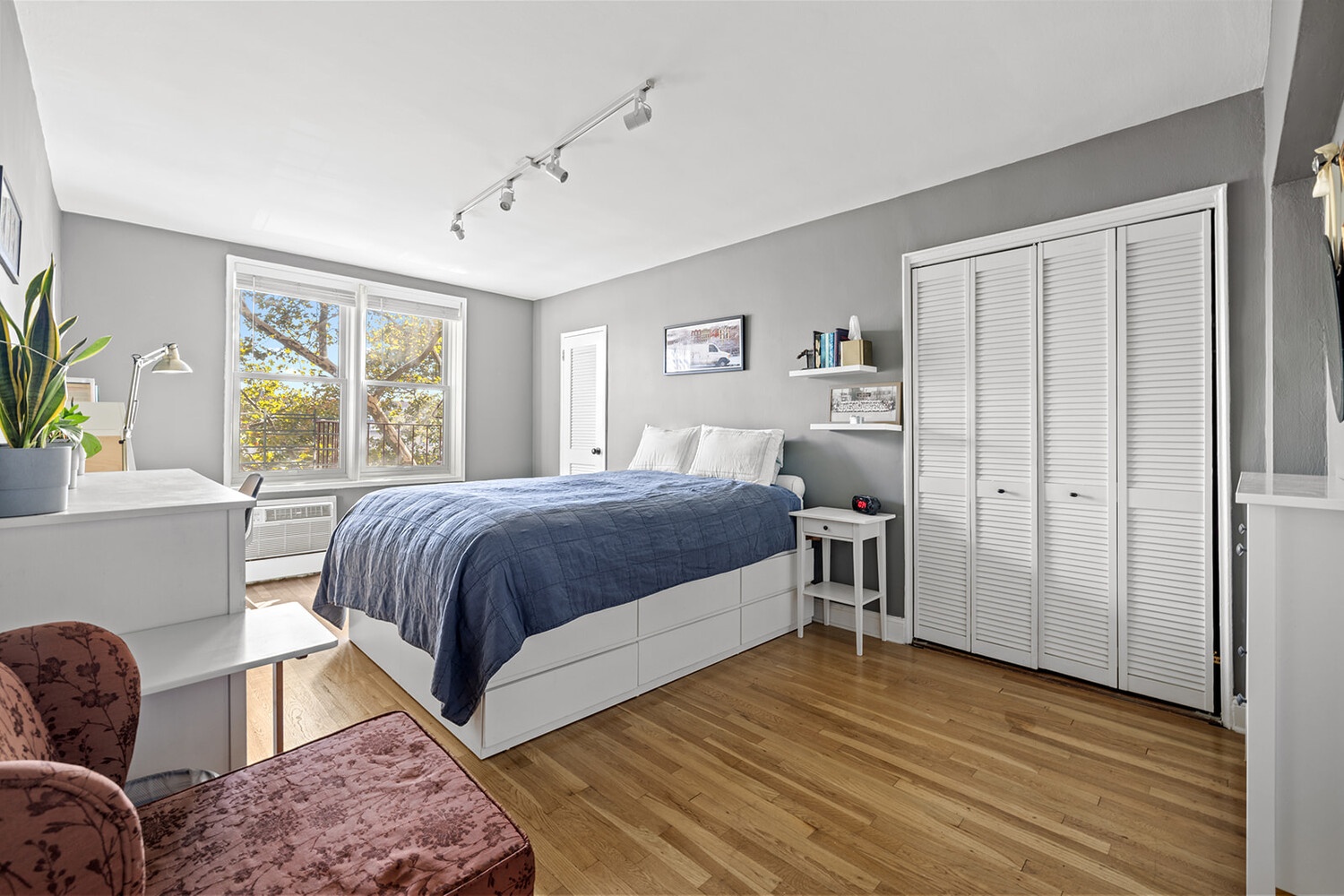 Spacious, light-filled three bedroom, two bath home boasts beautiful hardwood floors, three exposures (east, west, and north), and an abundance of closet space! This quiet and peaceful corner residence has a great layout with all usable square footage, as the open living and dining room also provides for a home office area. The renovated windowed kitchen with stainless steel appliances, including a dishwasher, has a lot of countertop and storage space. The king-sized primary bedroom has two large closets and an updated en suite bathroom with a shower stall. The equally large second bedroom has eastern exposures and two closets and is across from the second bathroom, which has a combo shower/tub. Other hallmarks of this turn-key apartment include tasteful light fixtures and recessed lighting, through-wall A/C units, a true third bedroom with two exposures. and serene leafy treetop views throughout.