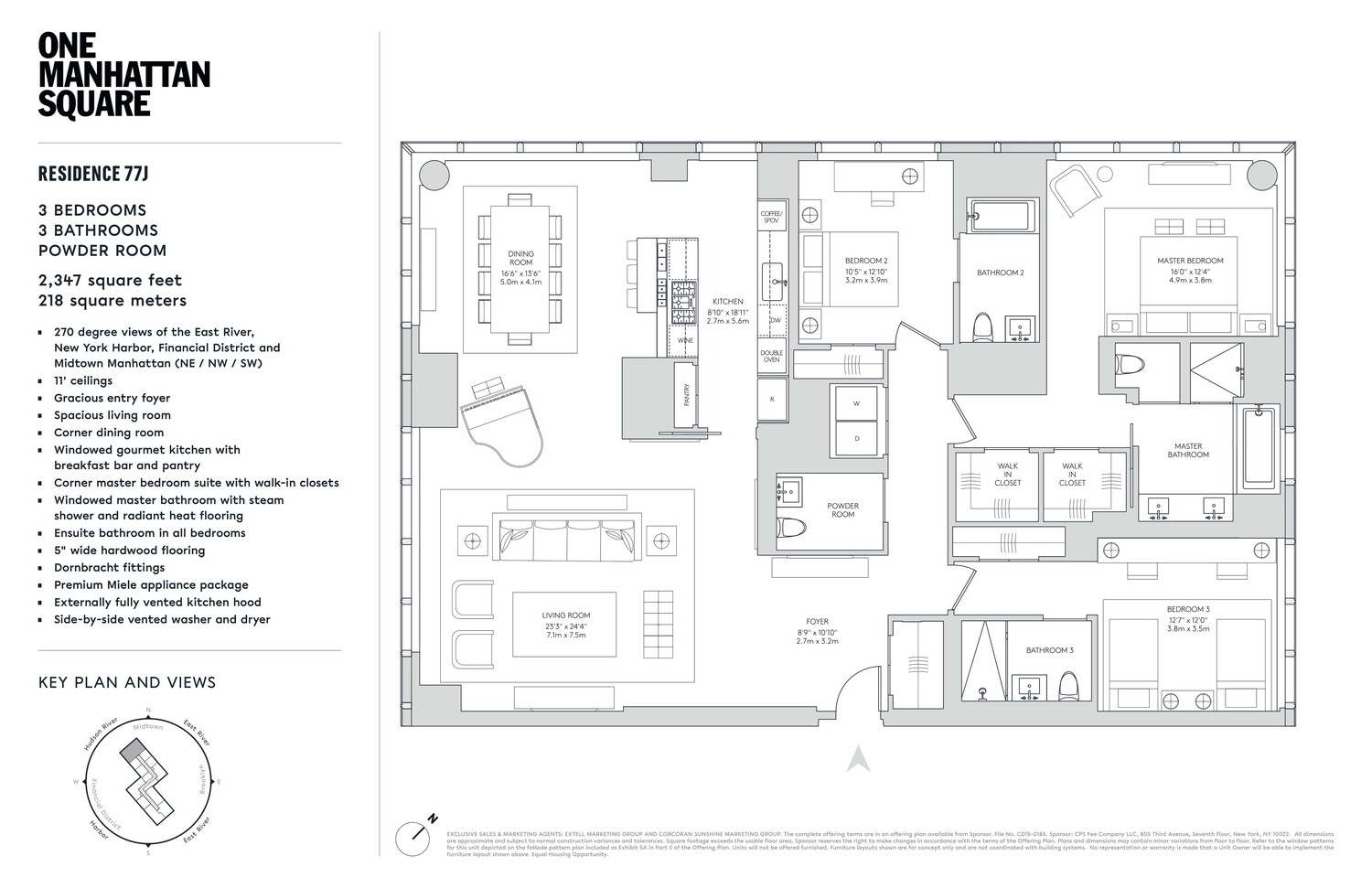 The Skyscape Collection, featuring Residence 77J, is a home in the sky. This generous 2,347 square foot triple exposure 3 bedroom, 3.5 bath residence is designed by Meyer Davis and features 270 degree views of the Lower East Waterfront, New York Harbor, Financial District and Midtown Manhattan. Astonishing panoramic views from South West and North West corner living room and dining room. Windowed gourmet kitchen with a breakfast bar, pantry closet, premium Miele and Subzero appliance package with a double oven plus speed oven, built-in whole-bean coffee system, integrated refrigerator, wine fridge, dishwasher and externally fully vented kitchen hood. Corner Master Bedroom suite with side-by-side walk-in closets, luxuriously appointed windowed 5 fixture ensuite bath with a steam shower, Wetstyle soaking bathtub with custom stone surround, radiant floor heating and a separate water closet. The second and third bedrooms are thoughtfully appointed with en-suite baths with imported stone and custom finishes. This residence comes equipped with a side-by-side, fully vented washer and dryer. A gorgeous powder room with a Boffi pedestal sink and Covelano marble polished stone accent wall and floors completes this magnificent home.