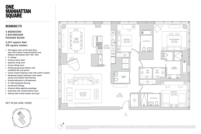 The Skyscape Collection, featuring Residence 77J, is a home in the sky. This generous 2,347 square foot triple exposure 3 bedroom, 3.5 bath residence is designed by Meyer Davis and features 270 degree views of the Lower East Waterfront, New York Harbor, Financial District and Midtown Manhattan. Astonishing panoramic views from South West and North West corner living room and dining room. Windowed gourmet kitchen with a breakfast bar, pantry closet, premium Miele and Subzero appliance package with a double oven plus speed oven, built-in whole-bean coffee system, integrated refrigerator, wine fridge, dishwasher and externally fully vented kitchen hood. Corner Master Bedroom suite with side-by-side walk-in closets, luxuriously appointed windowed 5 fixture ensuite bath with a steam shower, Wetstyle soaking bathtub with custom stone surround, radiant floor heating and a separate water closet. The second and third bedrooms are thoughtfully appointed with en-suite baths with imported stone and custom finishes. This residence comes equipped with a side-by-side, fully vented washer and dryer. A gorgeous powder room with a Boffi pedestal sink and Covelano marble polished stone accent wall and floors completes this magnificent home.