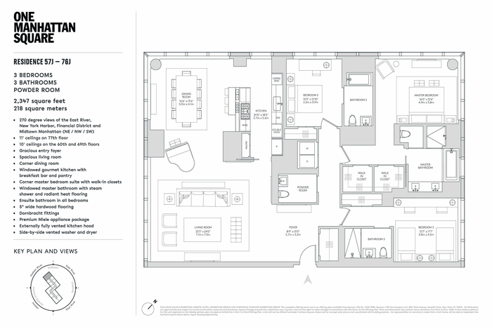 The Skyscape Collection, featuring Residence 77J, is a home in the sky. This generous 2,347 square foot triple exposure 3 bedroom, 3.5 bath residence is designed by Meyer Davis and features 270 degree views of the Lower East Waterfront, New York Harbor, Financial District and Midtown Manhattan. Astonishing panoramic views from South West and North West corner living room and dining room. Windowed gourmet kitchen with a breakfast bar, pantry closet, premium Miele and Subzero appliance package with a double oven plus speed oven, built-in whole-bean coffee system, integrated refrigerator, wine fridge, dishwasher and externally fully vented kitchen hood. Corner Master Bedroom suite with side-by-side walk-in closets, luxuriously appointed windowed 5 fixture ensuite bath with a steam shower, Wetstyle soaking bathtub with custom stone surround, radiant floor heating and a separate water closet. The second and third bedrooms are thoughtfully appointed with en-suite baths with imported stone and custom finishes. This residence comes equipped with a side-by-side, fully vented washer and dryer. A gorgeous powder room with a Boffi pedestal sink and Covelano marble polished stone accent wall and floors completes this magnificent home.