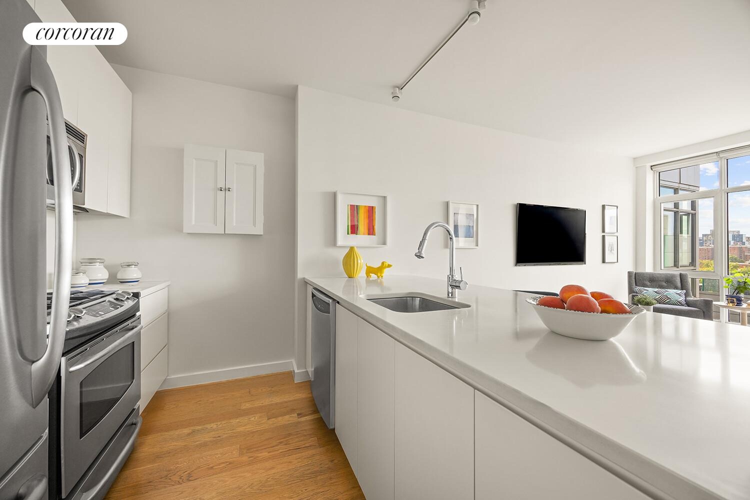 The living room has plenty of space to create a dining area and the open layout provides multiple ways to configure the space. The kitchen is a fantastic size, with white lacquer cabinetry, Caesarstone countertops, stainless steel appliances, and an abundance of storage and work space. The large peninsula easily seats four and creates a great gathering spot for meals and conversation.