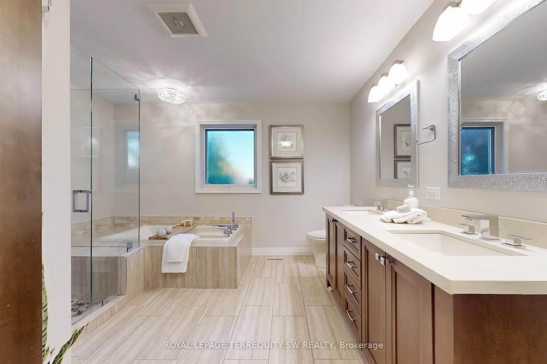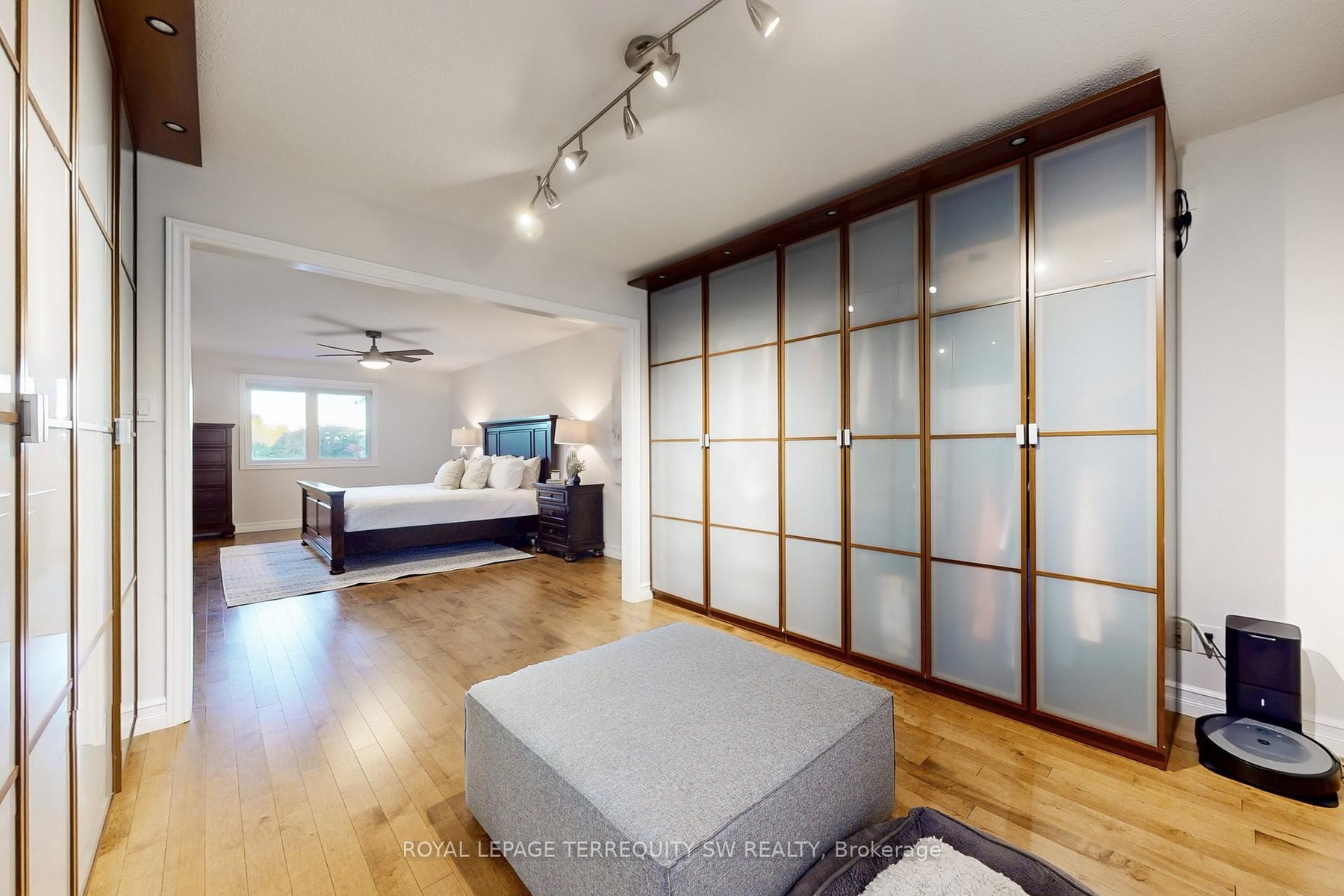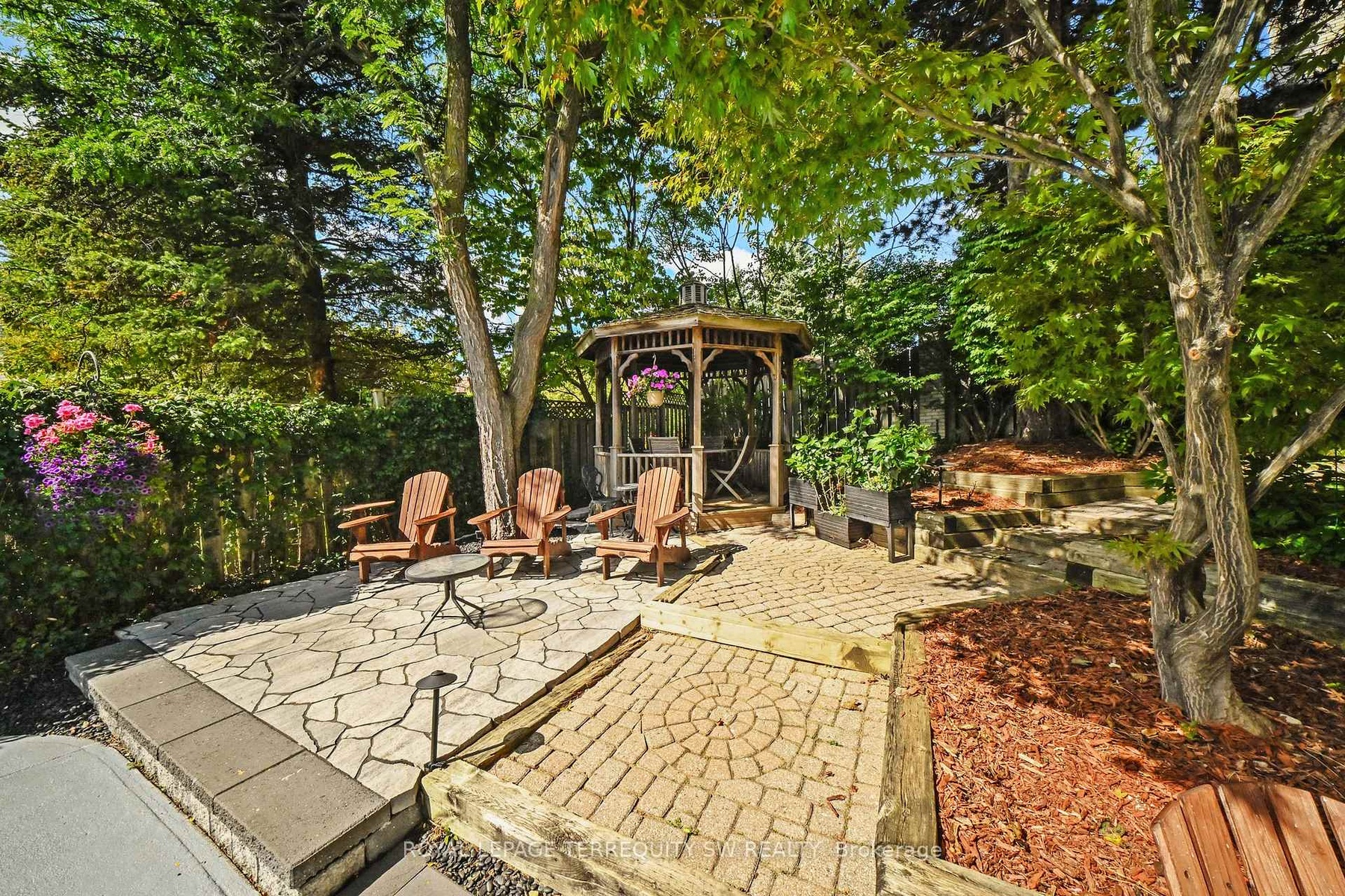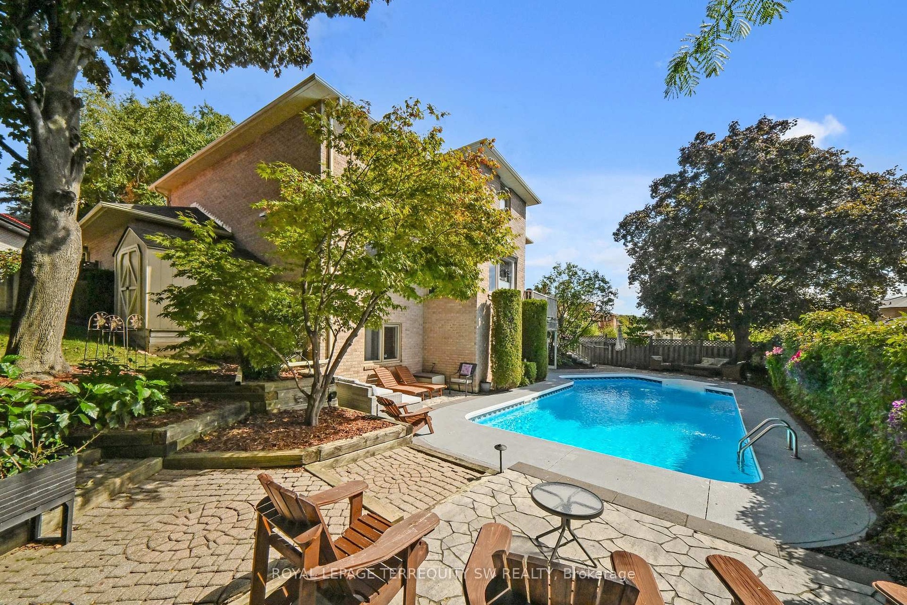 Tucked away on a quiet cul-de-sac in one of Brampton's most established enclaves, 8 Chalmers Court offers an exceptional balance of elegance, comfort, and family functionality. This detached two-storey executive brick home sits on a mature, pie-shaped lot-52 ft at the front widening to over 130 ft at the rear-surrounded by manicured gardens, mature trees, and resort-style outdoor living with a stone patio, gazebo, and pristine heated in-ground pool. A gracious foyer opens to distinct principal rooms with refined finishes: formal living and dining rms with French doors, smooth ceilings, and gleaming hardwood floors; a bright family room anchored by a gas fireplace, built-in cabinetry, and patio doors to the sun deck. The chef's kitchen impresses with granite countertops, centre island, custom backsplash, gas stove, under-mount lighting, pot lights, beverage fridge, and stainless-steel appliances. The adjoining breakfast room-featuring a bay window and walk-out to the deck-overlooks the lush gardens, gazebo, and pool. Upstairs, the spacious primary suite (incorporating the fifth bedroom) offers a private dressing area, hardwood floors, and a luxurious 4-pc ensuite with heated flrs, dble sinks, glass shower, and standalone tub. Three additional bedrooms and a skylit hallway complete the level. The finished lower level adds a versatile recreation room with wood-burning fireplace, wet bar, games area, 4-pc bath with Jacuzzi, exercise space, built-ins, and a walk-out to the patio. Recent updates incl roof (2023), main bath (2016), new blinds throughout, 200-amp service + pony panel, pool liner(10 yrs), pump (5 yrs), heater(10 yrs), and backyard patio (3 yrs). Additional features: central air, central vac, security system, in-ground sprinklers, landscape lighting, and gas line for BBQ/fire table. Minutes to schools, parks, and major routes (410/407/401), this is a beautifully maintained executive residence on a peaceful court-where pride of ownership shines inside and out.