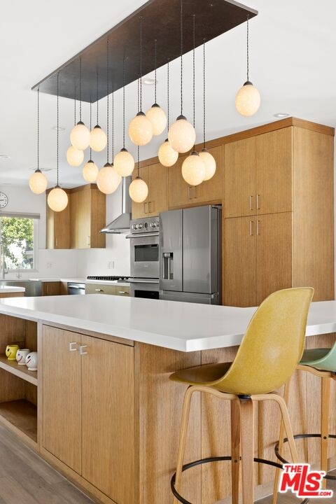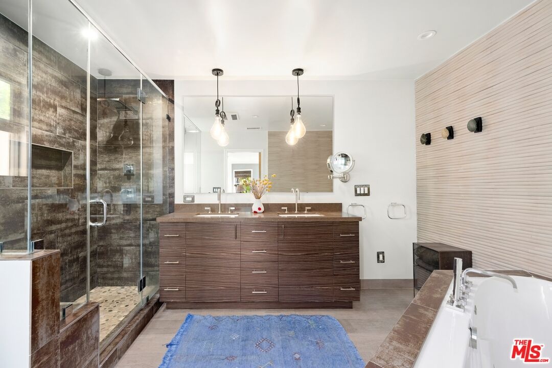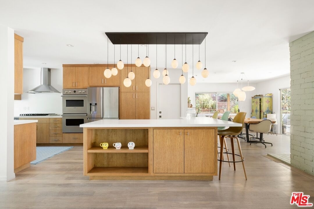 Located in Lakeridge Estates, a mid-century neighborhood near the Lake Hollywood Reservoir, 6570 Lakeridge Road is a 2,201 square foot ranch-style home that has been thoughtfully redone for modern living. Sunlight moves easily through an open floor plan that leads to multiple outdoor areas designed for entertaining. A new pool is ready for the summer heat and evenings spent under the stars. The large living and formal dining rooms share a two-sided fireplace, one functional and one decorative, and connect to a reimagined kitchen with a quartz-wrapped island, Viking double ovens, custom ventilation hood, and fixtures that recall the home's original design era. The primary bedroom opens directly to the pool deck. Its en-suite bathroom includes a soaking tub, step-in shower, dual sinks, and recently installed chrome fixtures. Two additional bedrooms share a second bathroom, with one room offering direct access. An oversized two-car garage with direct entry includes built-in storage and a raised laundry platform with side-by-side LG washer and dryer, installed two years ago. A gated perimeter with driveway and pedestrian gates adds privacy and extra off-street parking. A five-camera security system and 24-hour live neighborhood patrol offer additional peace of mind. Set on a 12,027 square foot lot, the property is located near hiking trails, the Hollywood Bowl, studios, and markets including Whole Foods and Trader Joe's. This is Southern California living with clarity and intention.