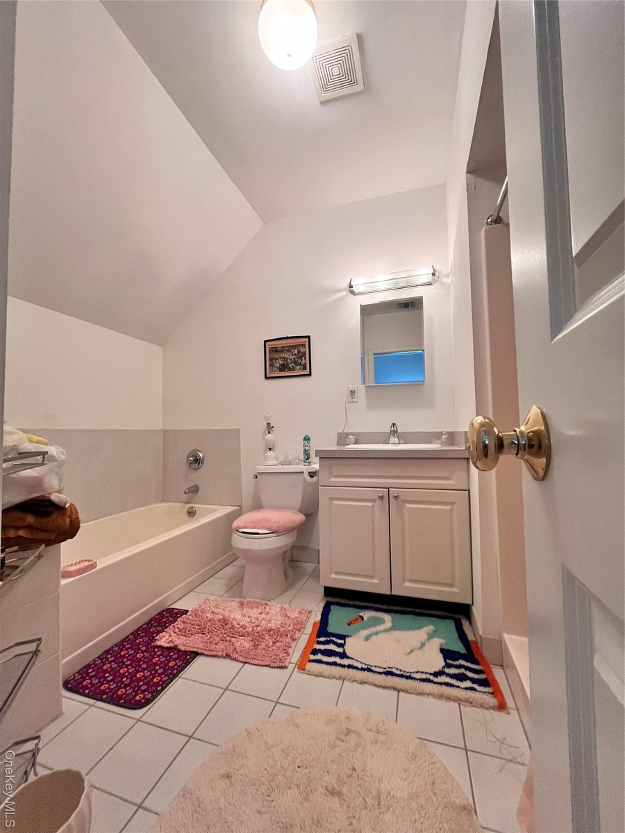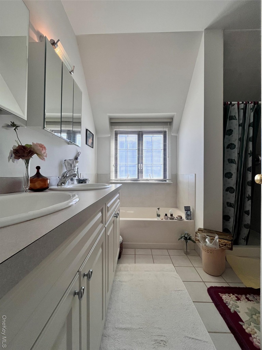 - Full bathroom with vanity, vaulted ceiling, a garden tub, and light tile patterned flooring