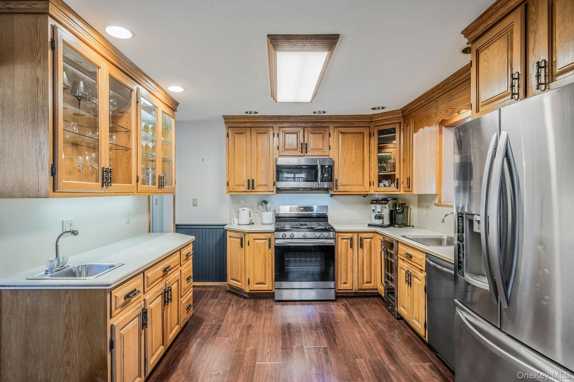 - Kitchen with appliances with stainless steel finishes, glass insert cabinets, wine cooler, light countertops, and dark wood-style floors
