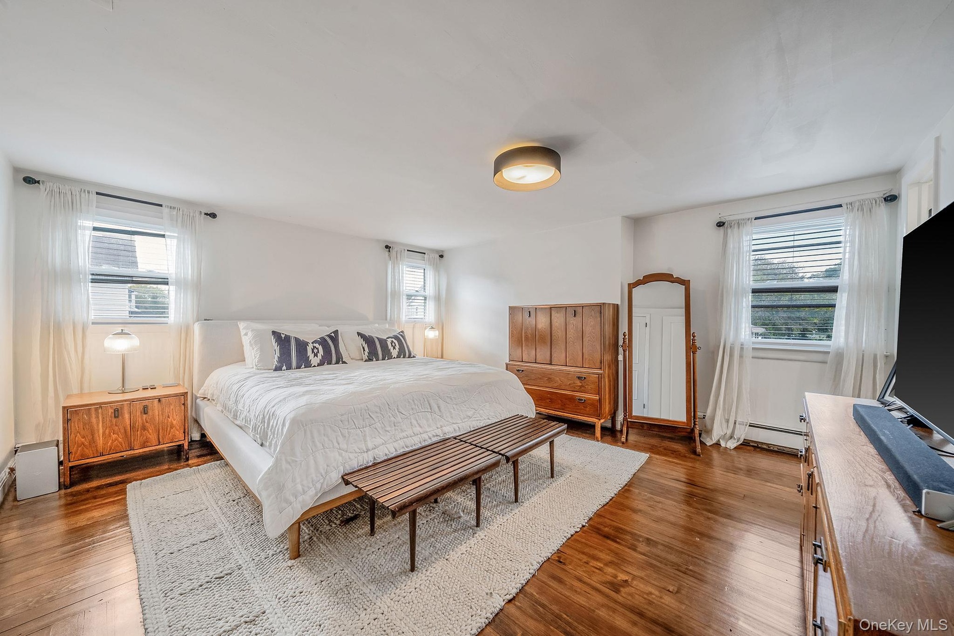 - Bedroom with multiple windows, dark wood-type flooring, and a baseboard radiator