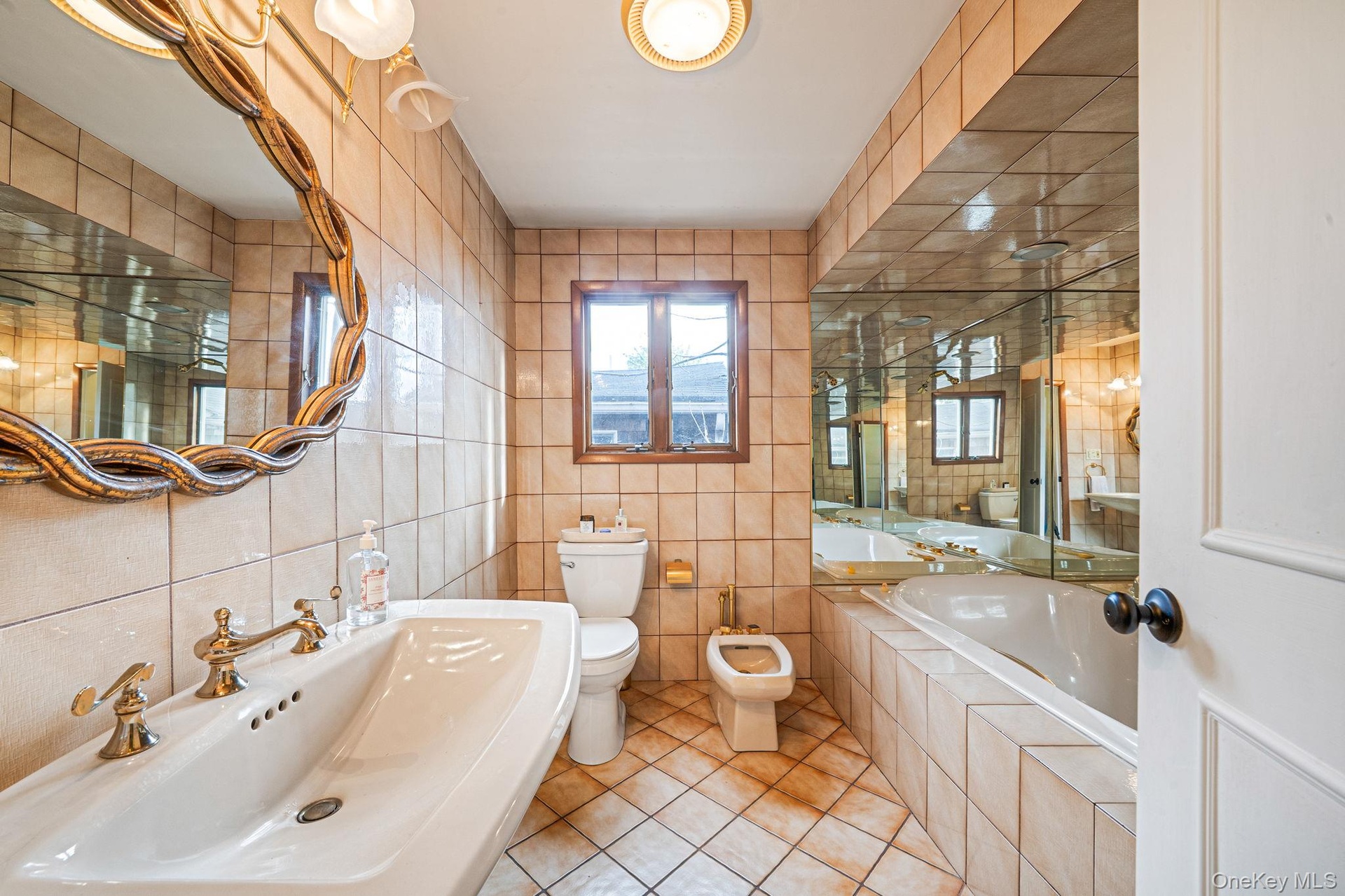 - Bathroom with tile walls, a tub with jets, and a bidet
