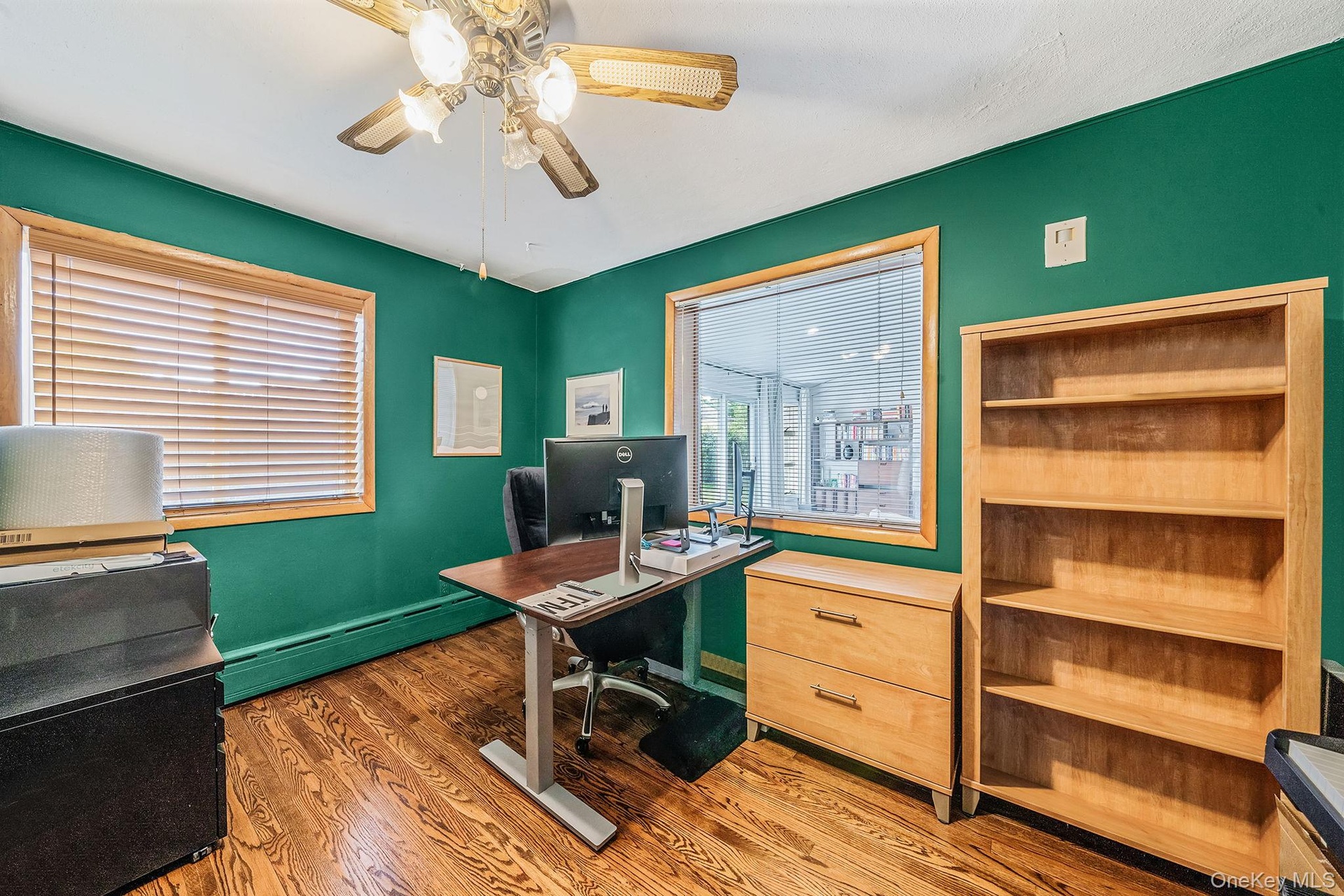- Office space with light wood-style floors, baseboard heating, and a ceiling fan