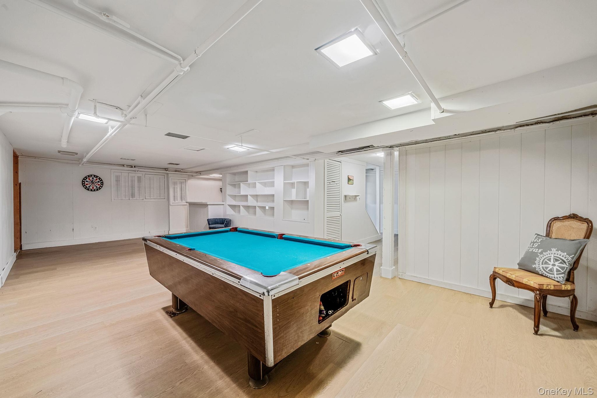 - Playroom with billiards table, light wood-type flooring, and bar area