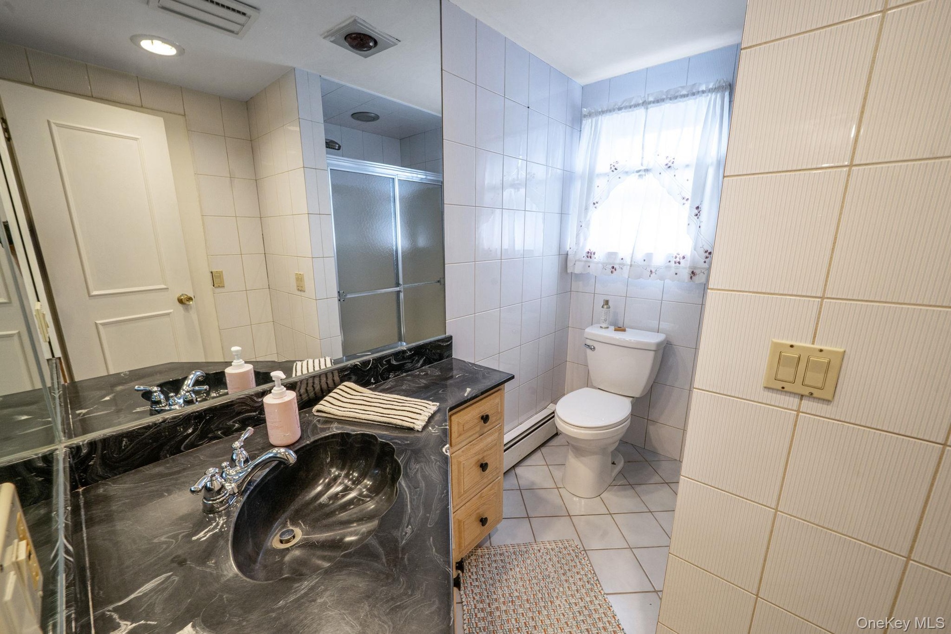 - Bathroom with tile walls, light tile patterned floors, a shower stall, vanity, and a baseboard heating unit