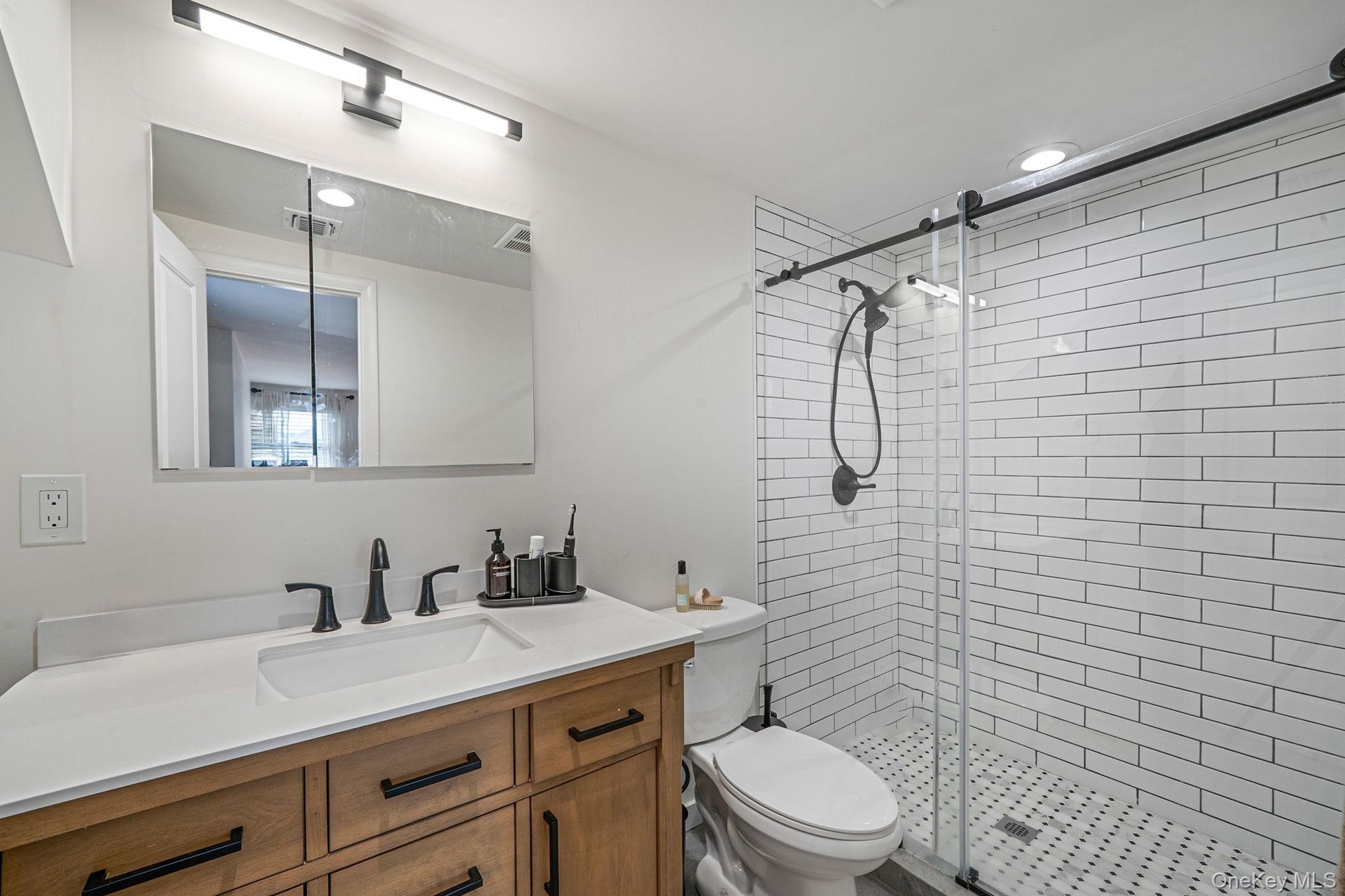 - Bathroom with a stall shower, vanity, and recessed lighting