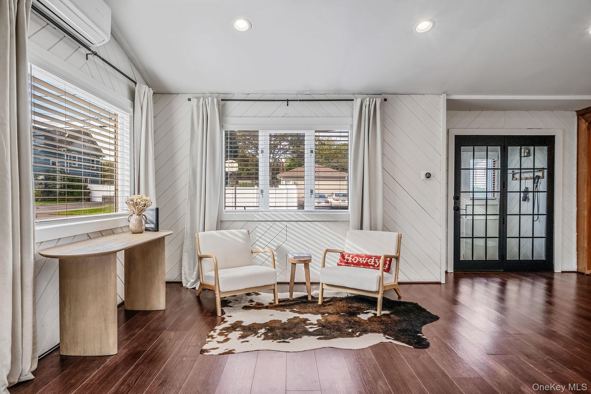 - Living area featuring wood walls, dark wood-style flooring, recessed lighting, and a wall mounted air conditioner