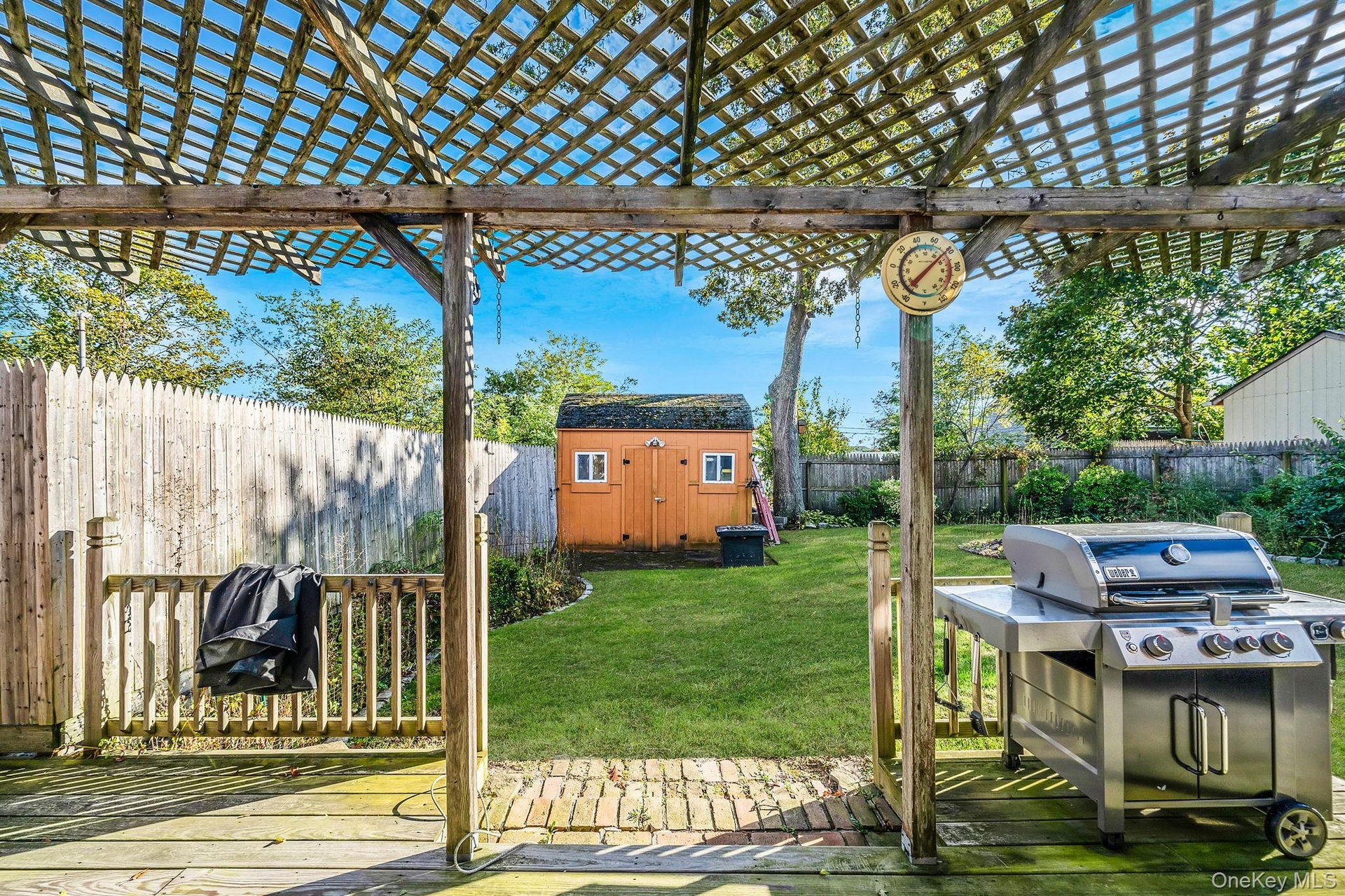 - Fenced backyard featuring a pergola, grilling area, and a storage unit