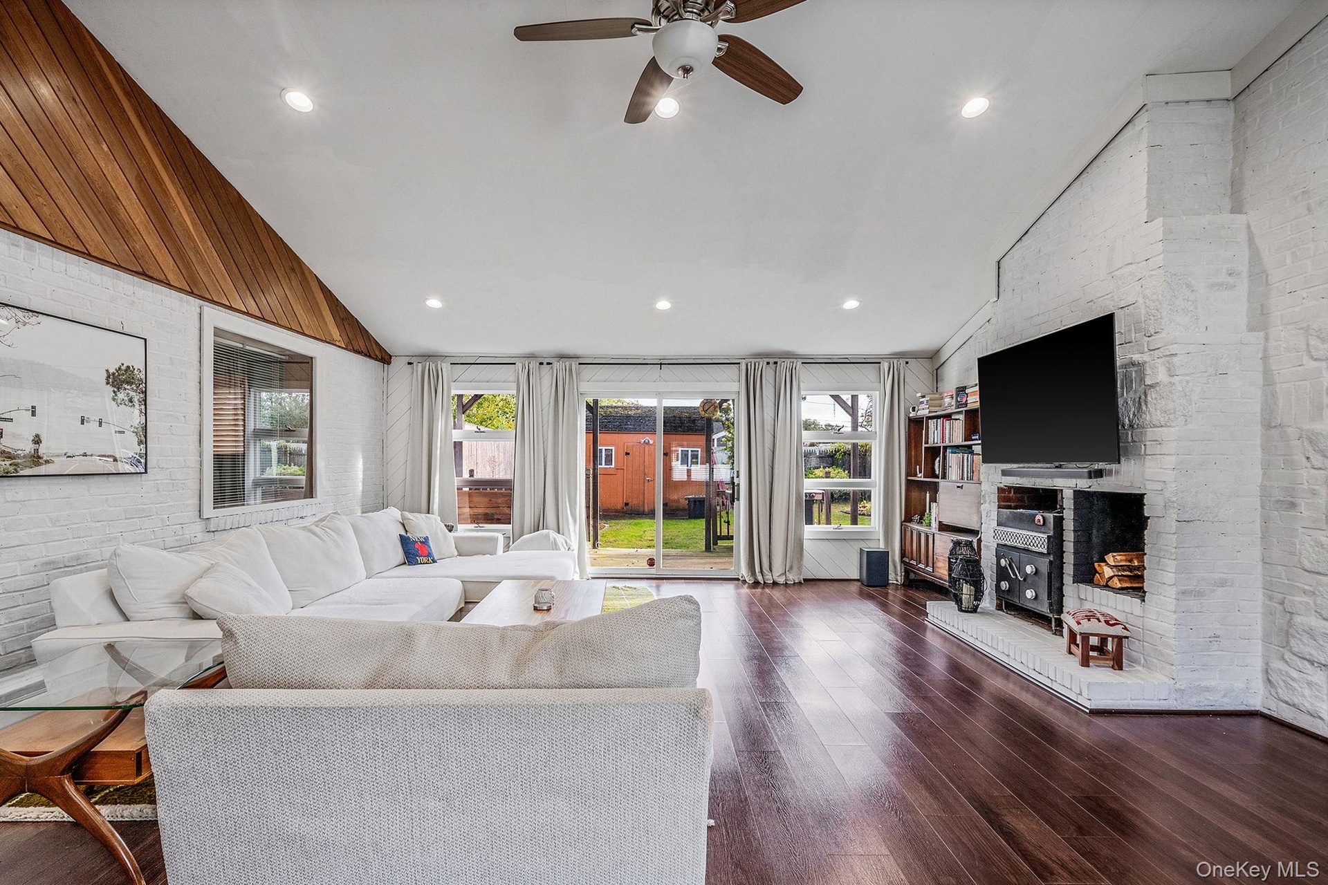 - Living room featuring baseboard heating, dark wood-style flooring, ceiling fan, recessed lighting, and a large fireplace