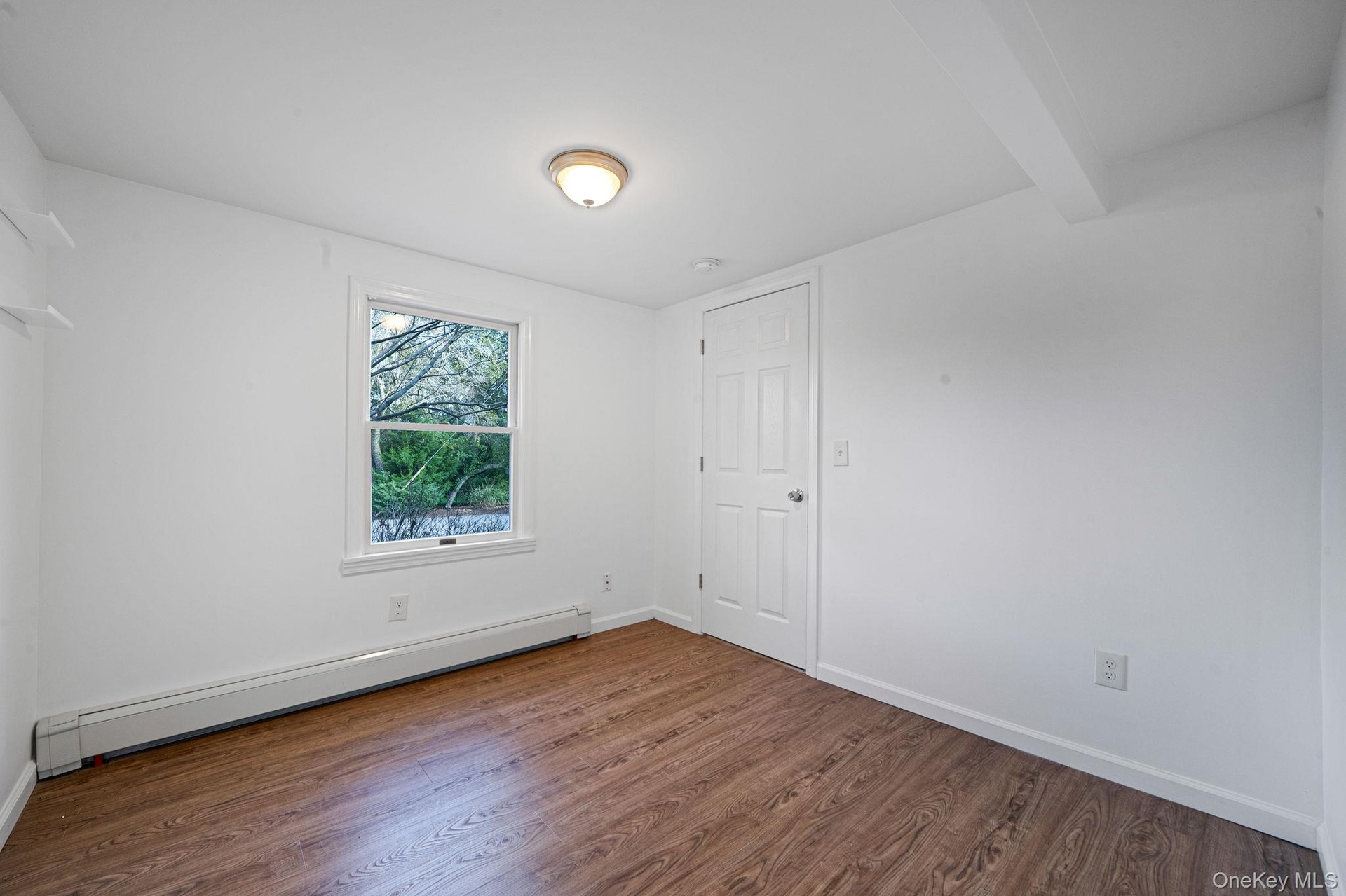 - Empty room featuring a baseboard heating unit and wood finished floors