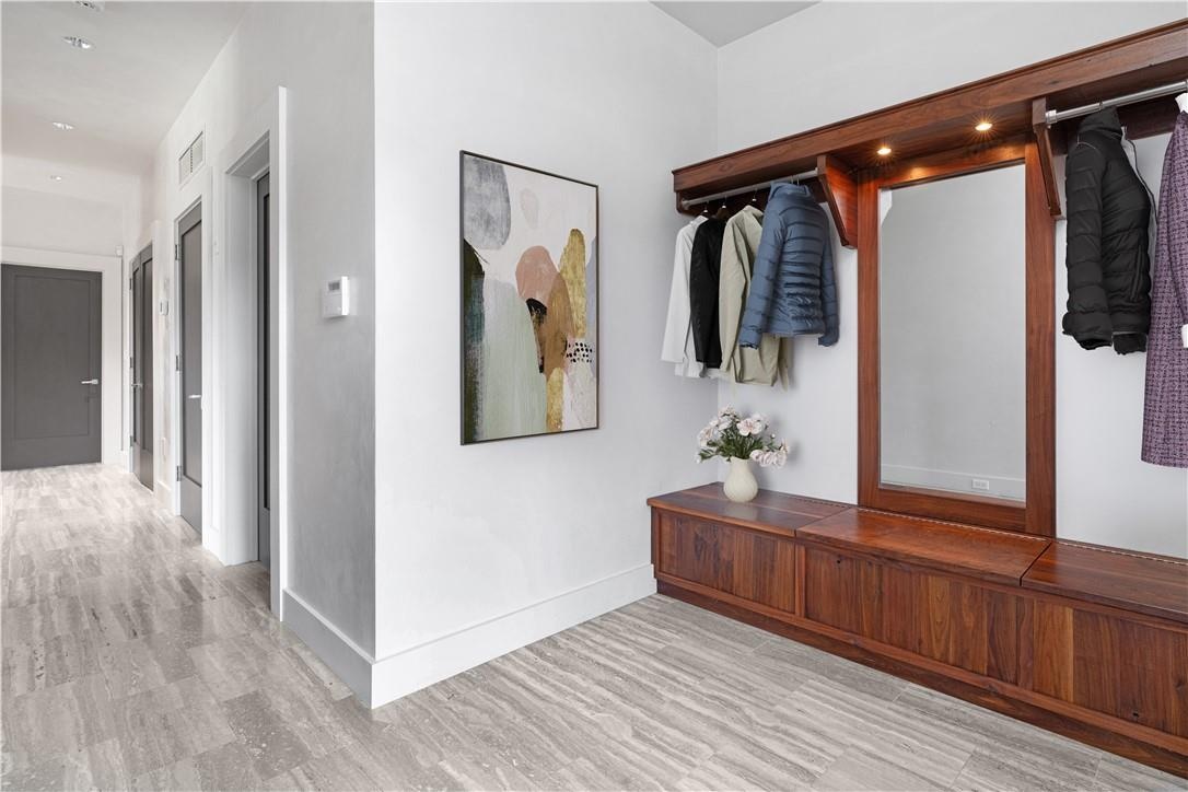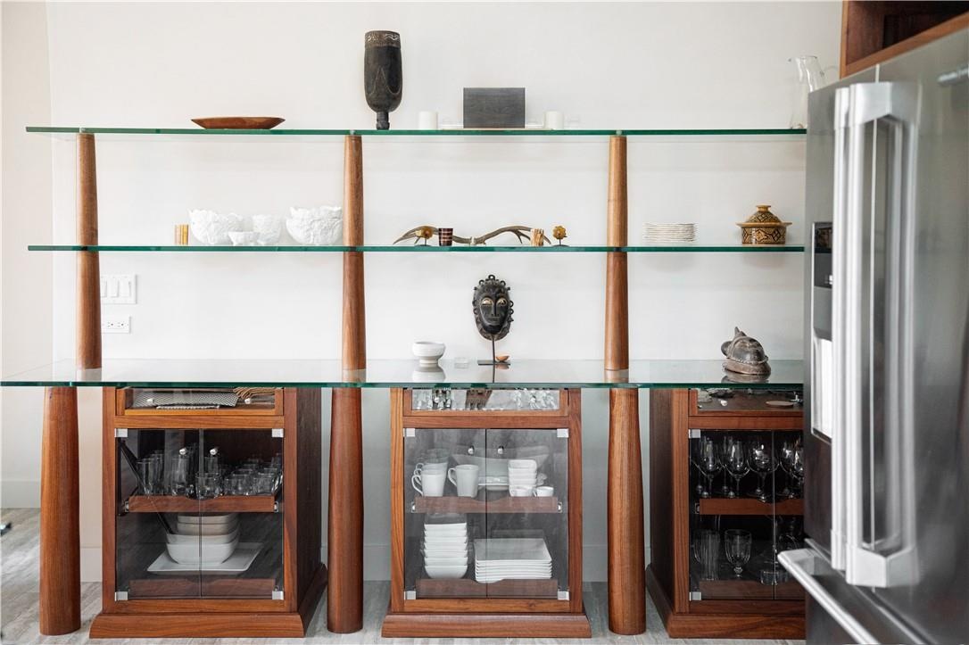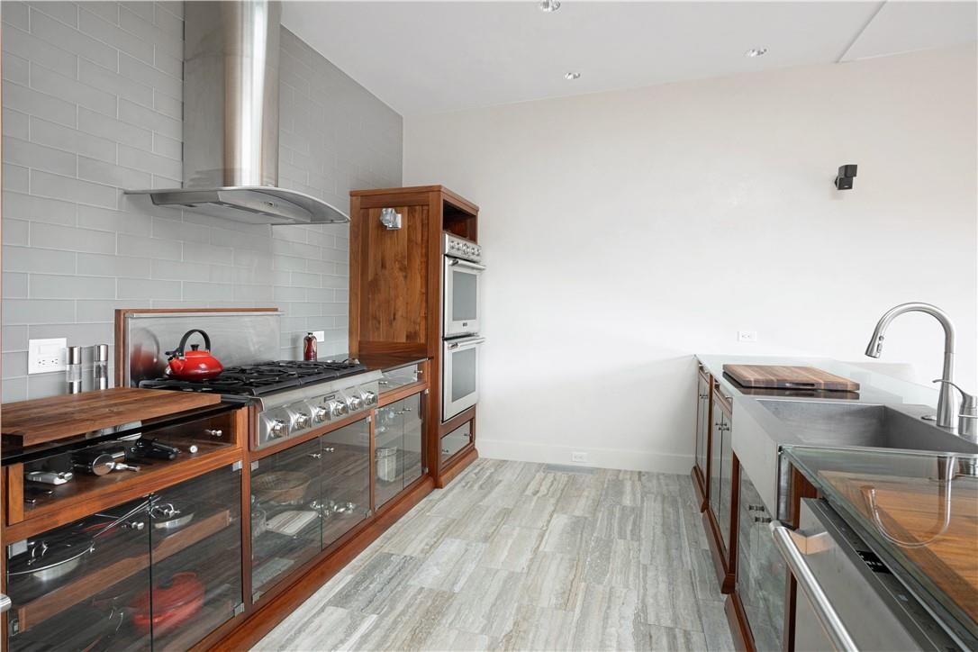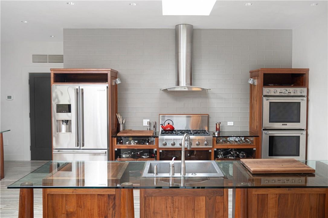 This distinctive copper-clad home comprises 2 bedrooms and 1 bath, showcasing meticulous craftsmanship with handcrafted Black Walnut woodwork imported from Thailand. As you step inside, the attention to detail is immediately evident, highlighted by floor-to-ceiling windows adorned with custom drapes, glass countertops, a gas fireplace, and radiant heated floors throughout. The kitchen is equipped with top-of-the-line Thermador appliances, ensuring a premium culinary experience. The home also features an automatic generator, providing peace of mind during power outages.