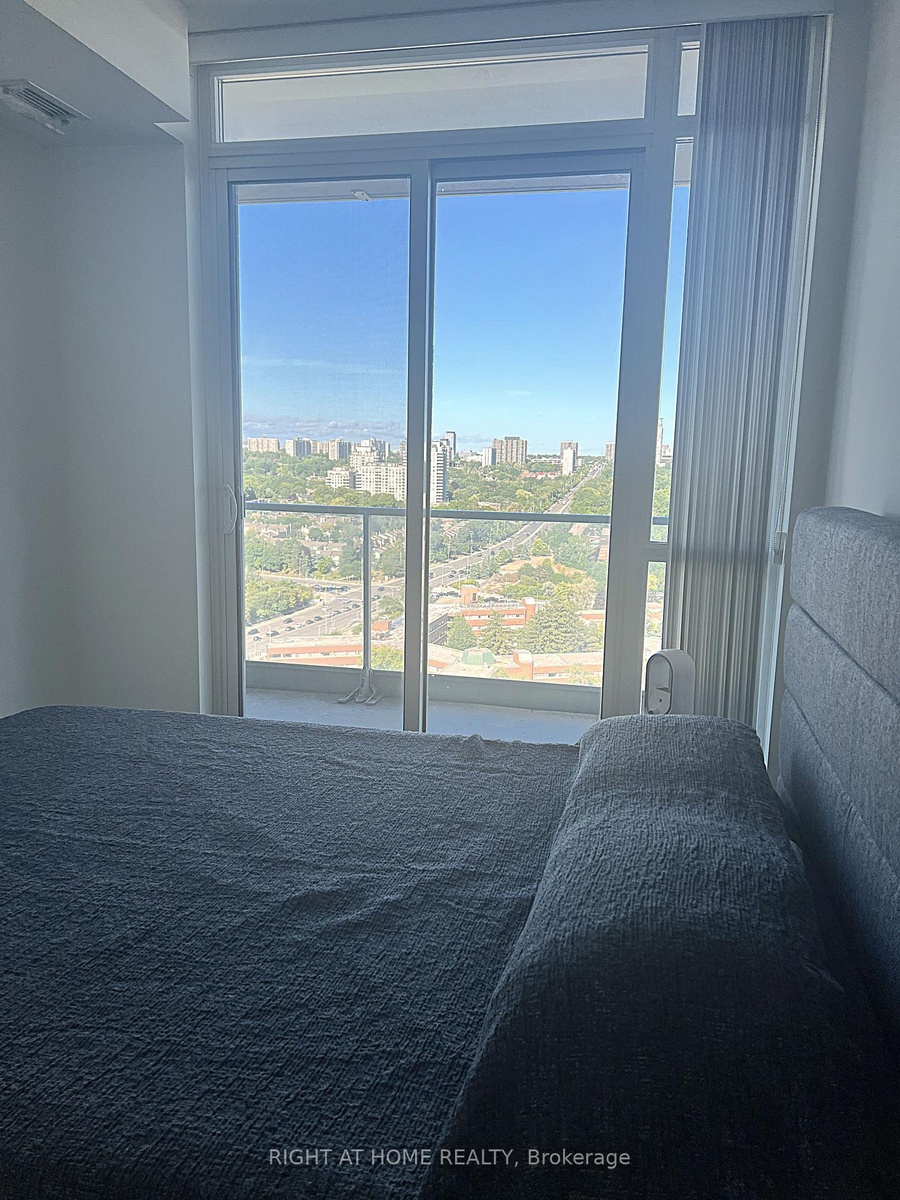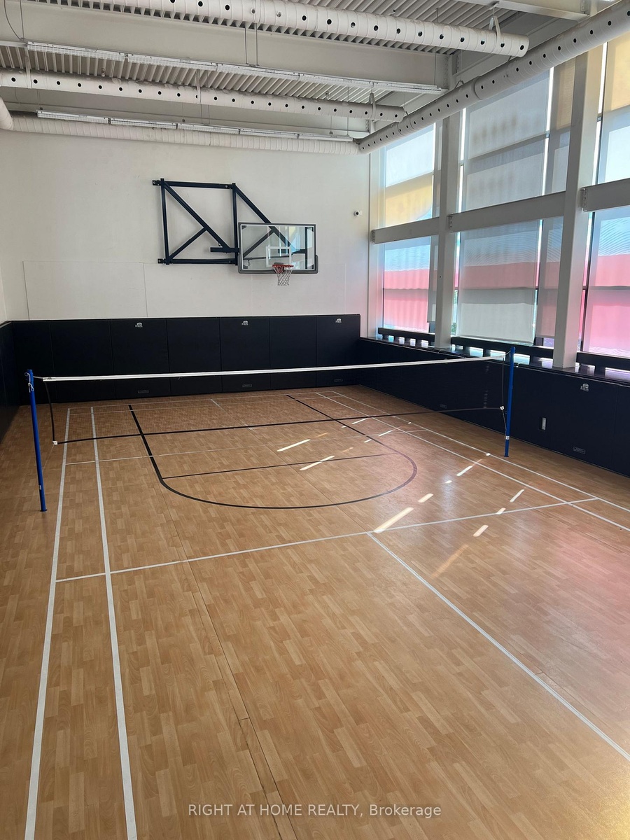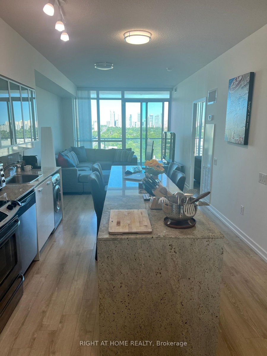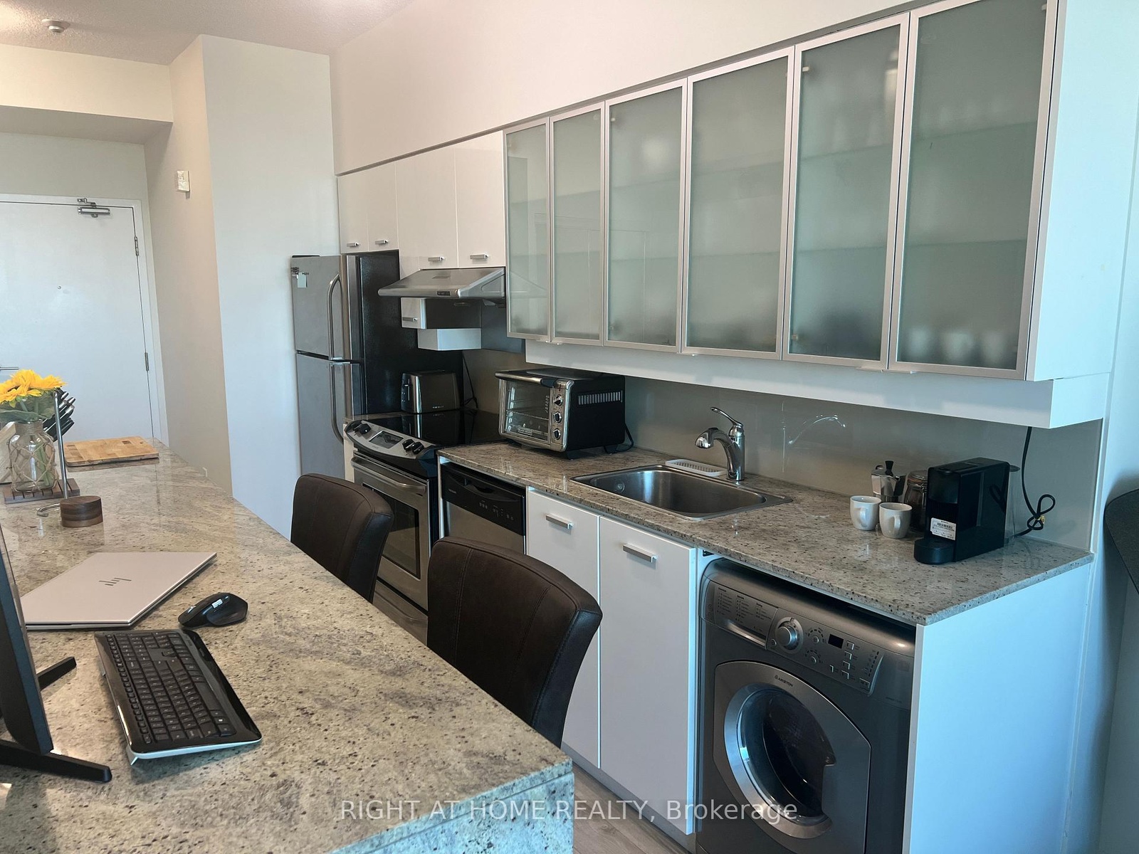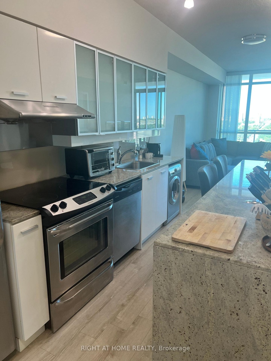 Large 1-bedroom + den (700+ SF), large balcony (116 SF) with indoor parking. With floor to ceiling windows (9-ft ceilings), and an open-concept living and kitchen area, plenty of natural sunlight covers the main living space. Unit comes either fully furnished / partially furnished / vacant of furnishings. The open concept kitchen has a large granite waterfall island and comes with S/S appliances: stove/oven, hood fan, dishwasher, fridge/freezer, microwave, toaster, and toaster oven. Large den is great for dining / work-from-home office / or bedroom area. The unit also has in-suite, all-in-one washer dryer. Plenty of cupboard space with a large modern pantry for storage. The main bedroom has a large double-sized closet, easily fits a queen-sized bed, with ceiling to floor windows and a sliding door that walks out to the balcony. Highly walkable (walk score = 80) community, with quick access to Hwy401, TTC or GoTrain. Building amenities: basketball/badminton court, an exercise/fitness room, movie room, party room, shared BBQ patio/terrace, play room for infants/young children, a lap pool with hot tub, steam room, games/card room, pet grooming room (dog-friendly building), shared laundry room (pay-as-you-go), bike racks (rentable), guest suites, & visitor parking (P1).