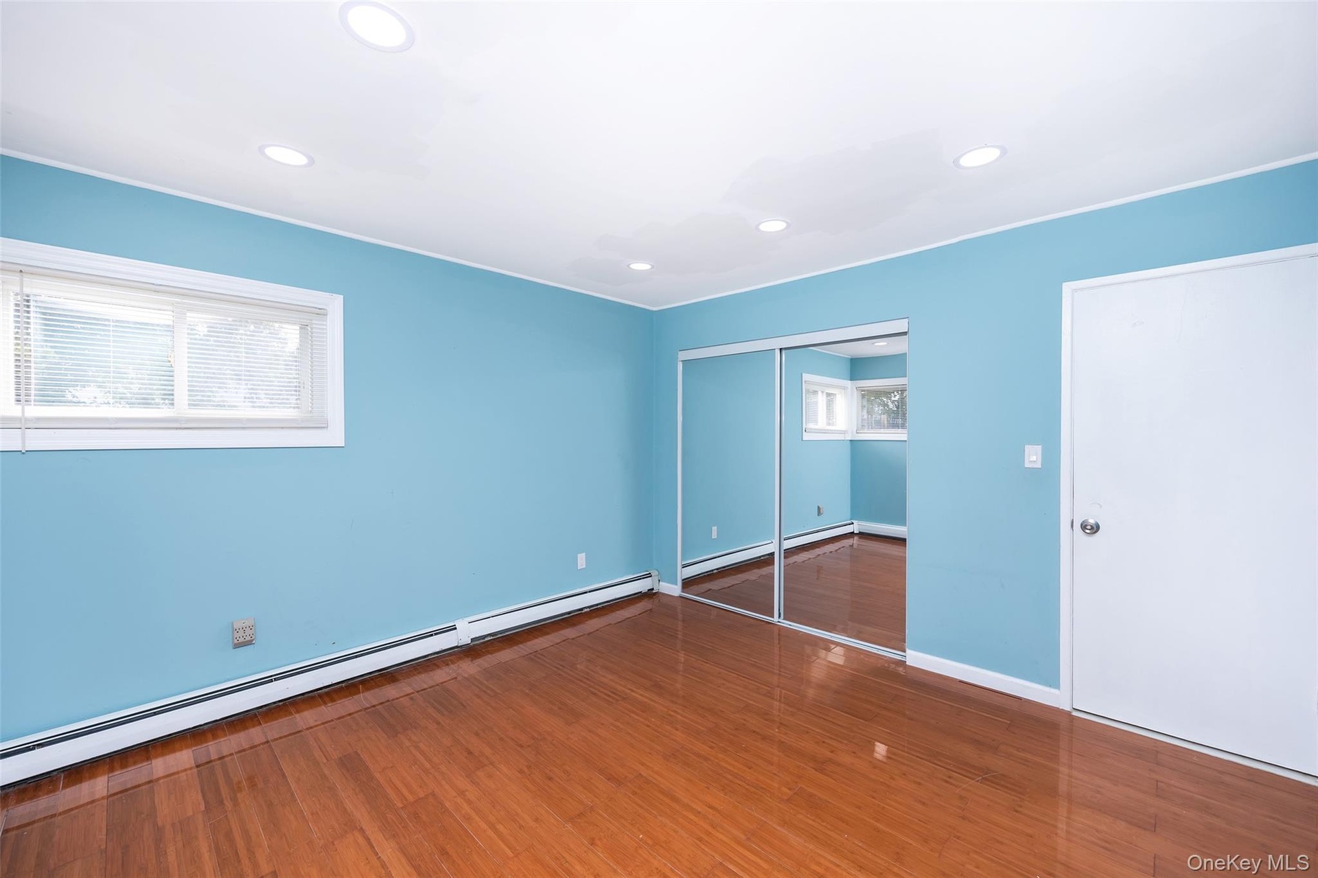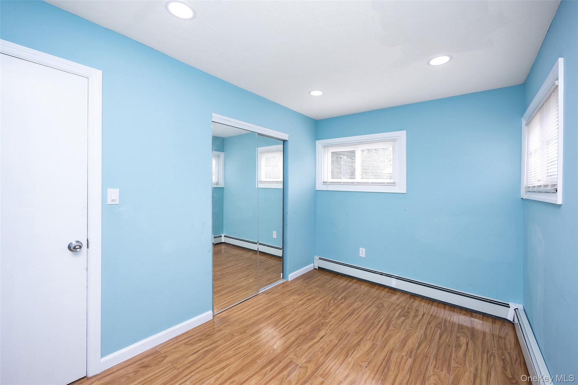 - Unfurnished bedroom with wood finished floors, recessed lighting, a closet, and a baseboard heating unit