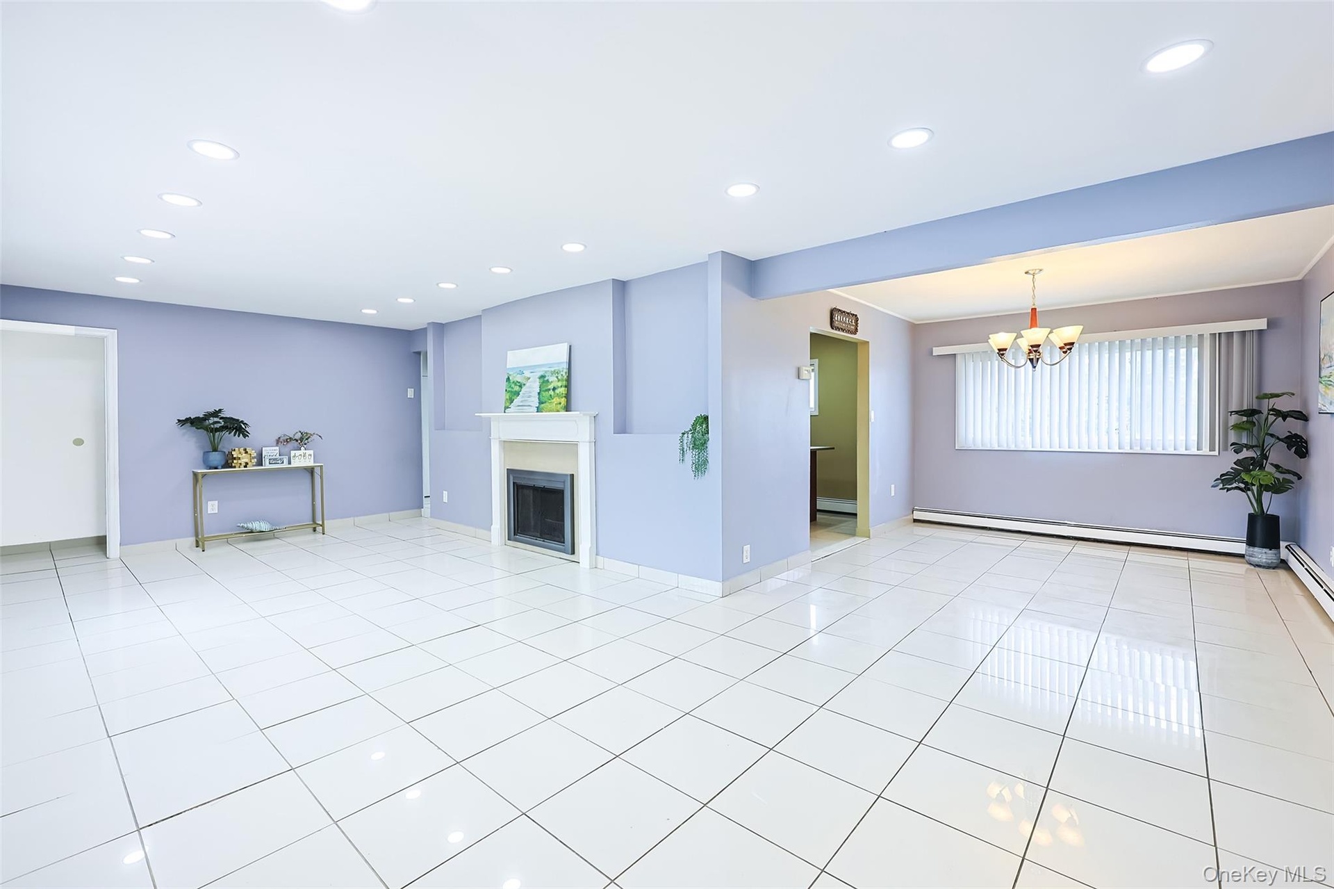 - Unfurnished living room with a baseboard radiator, a fireplace, light tile patterned floors, and recessed lighting
