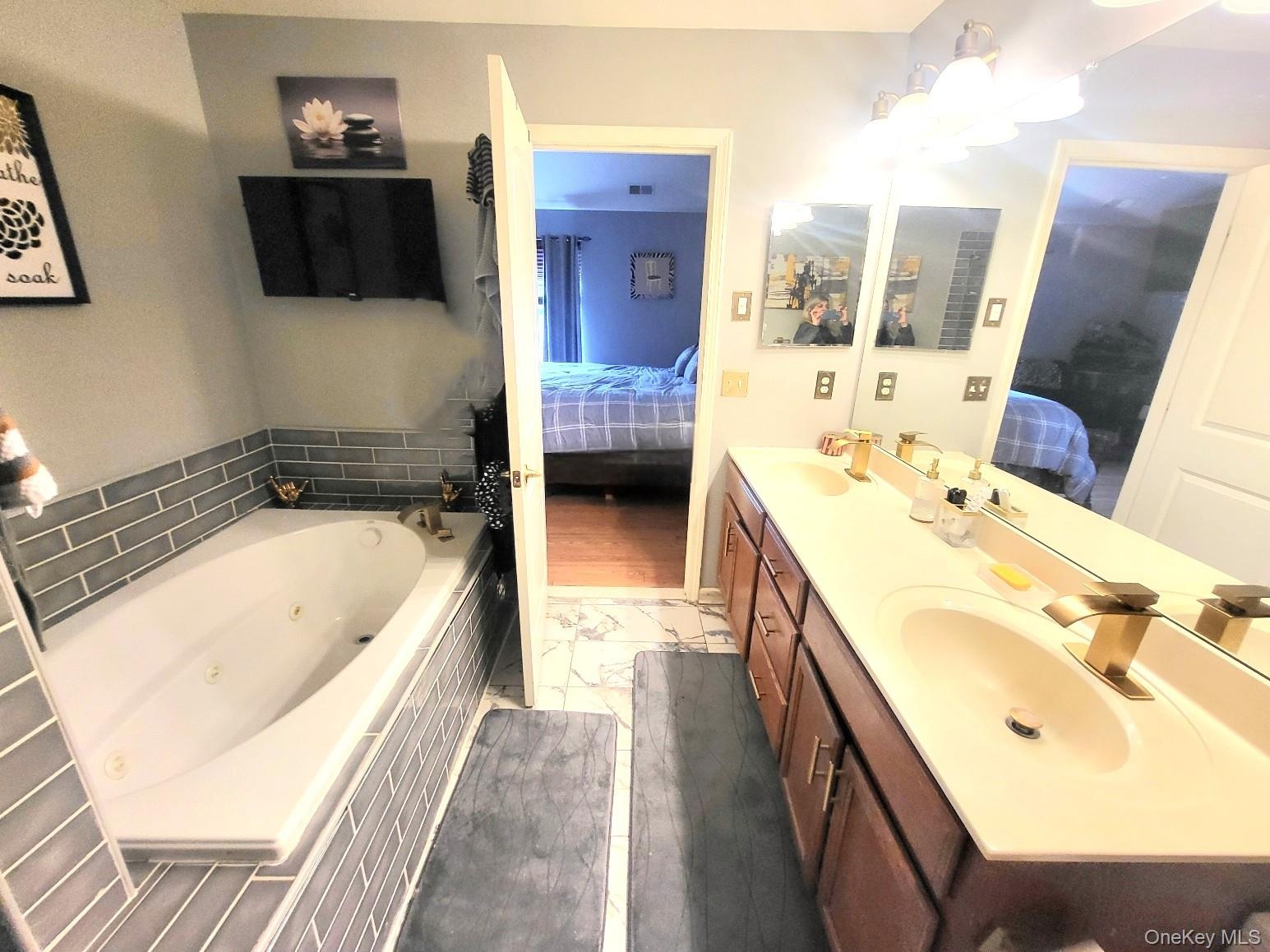 - Ensuite bathroom featuring a jetted tub and double vanity
