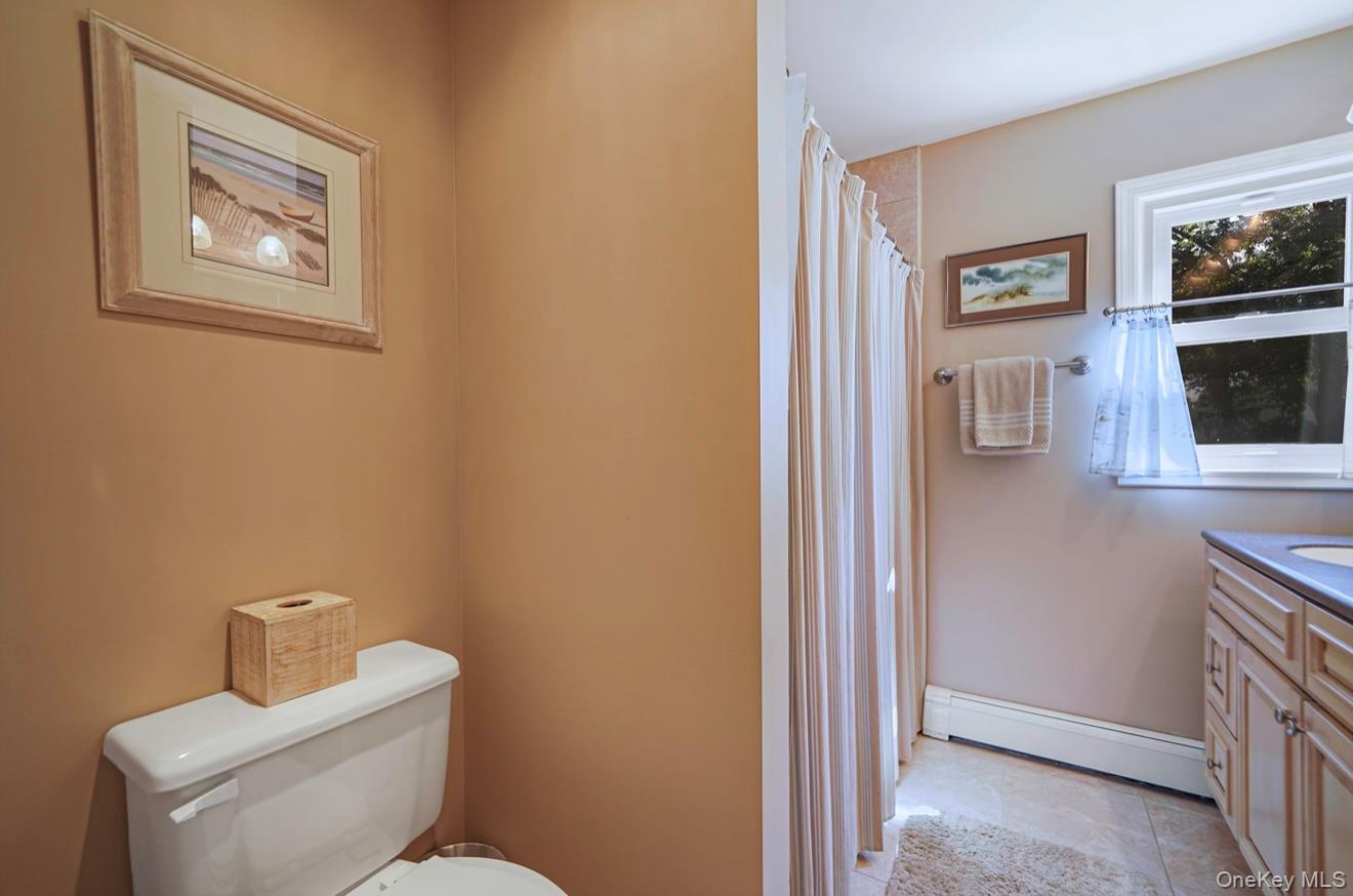 - Bathroom featuring vanity, a baseboard heating unit, a shower with curtain, and light tile patterned flooring