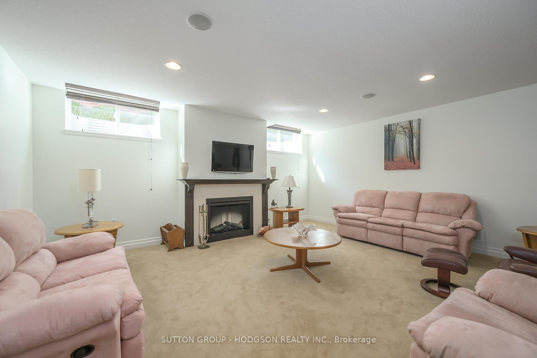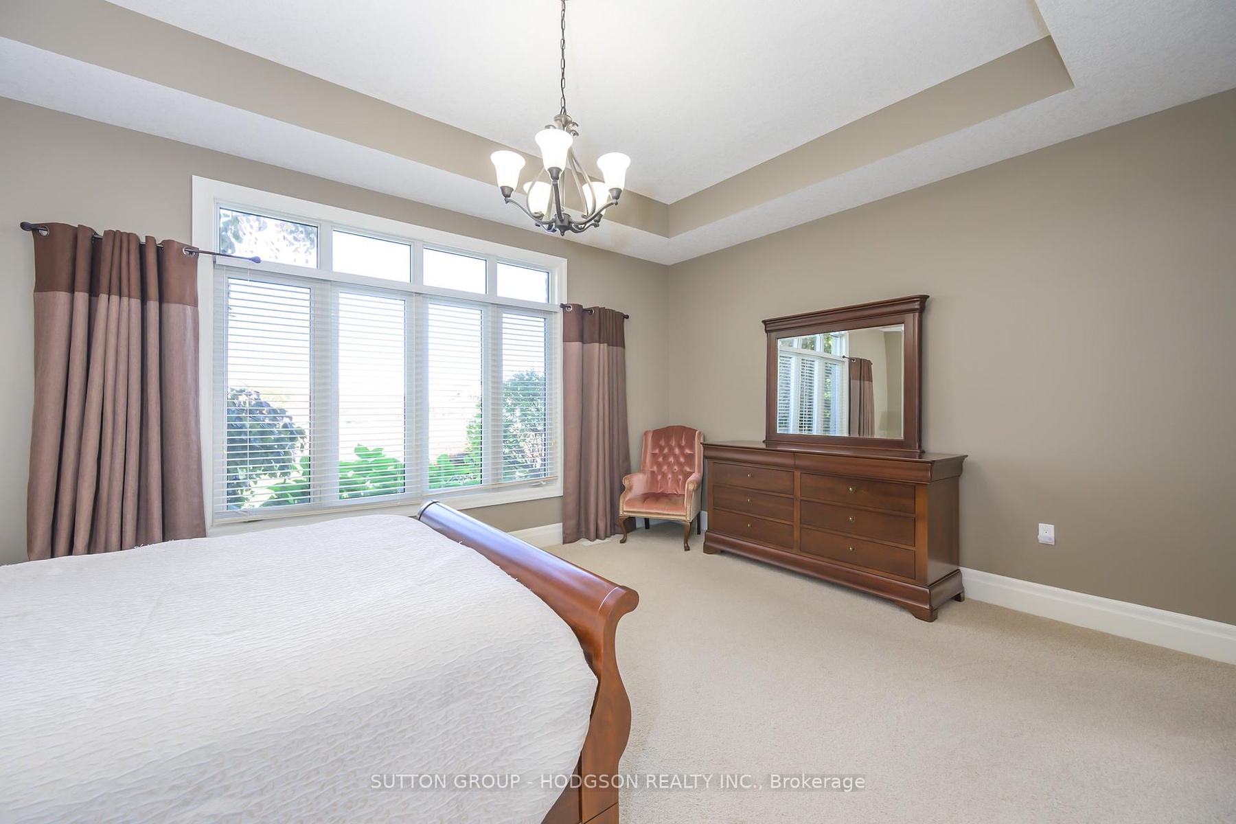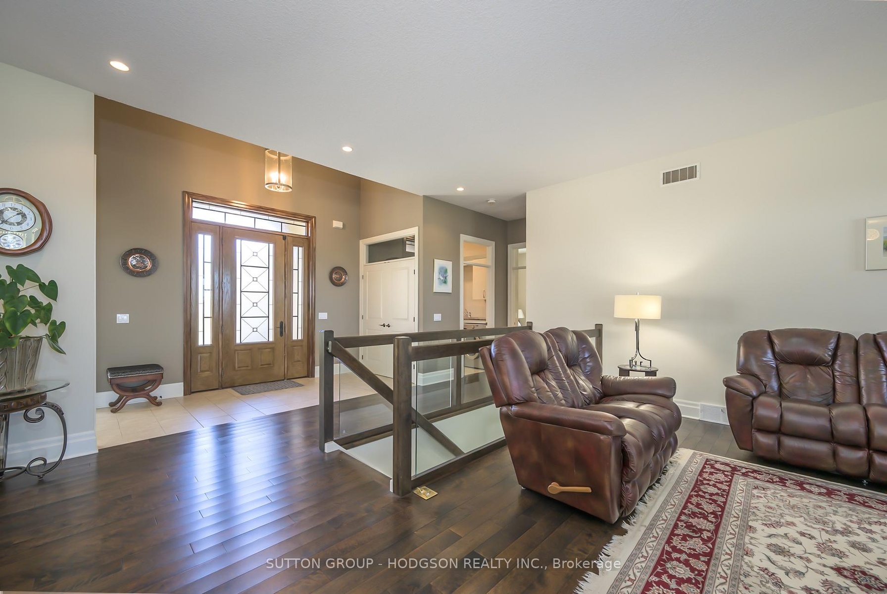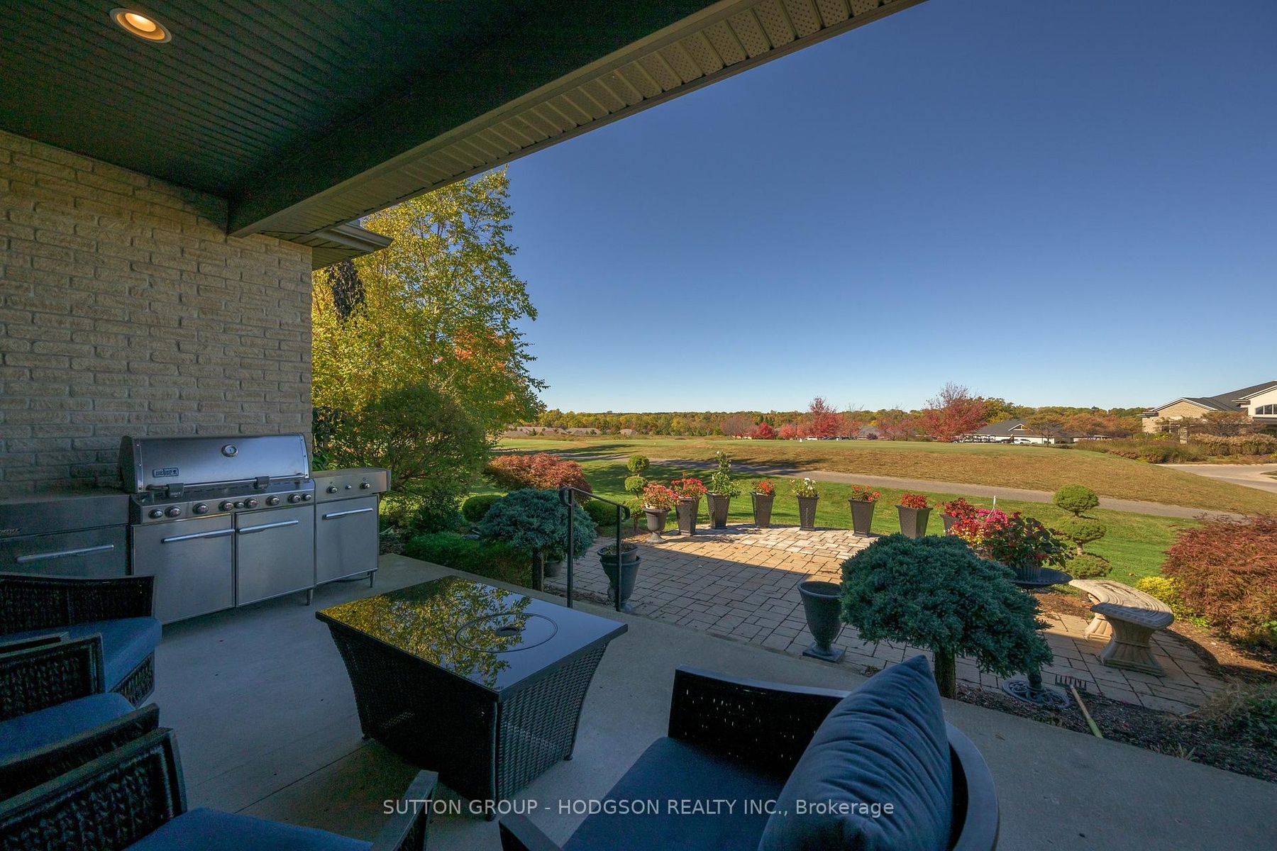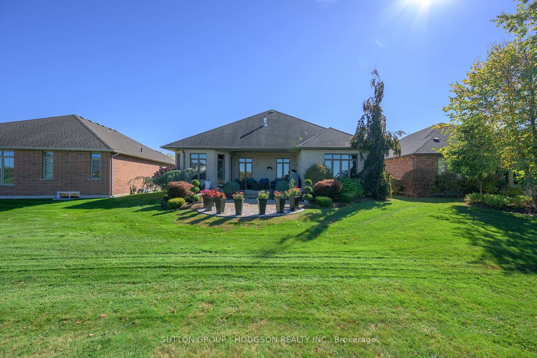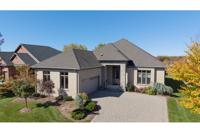 Welcome to this elegant residence in the prestigious Riverbend Golf Community, where upscale design meets a serene natural setting. Offering impressive curb appeal with stone pillars and manicured landscaping, this home combines warmth, sophistication, and functionality. Inside, you'll find high ceilings, an open-concept layout, and expansive hardwood flooring throughout the main level. The great room features a cozy fireplace and views of the golf course, while the formal dining room is perfect for hosting holidays and special occasions. The kitchen impresses with abundant crowned cabinetry, stone counters, stainless appliances, a pantry, and a sunlit eating area overlooking the fairway. The main floor office with custom built-ins provides a quiet, versatile space for work or reading. Two generous bedrooms each enjoy private ensuites, with the spacious primary offering three closets and an ensuite with a large shower. A stylish powder room, laundry area, and garage with golf cart parking complete the main level. The finished lower adds outstanding lifestyle space with a large family room, games area with wet bar, movie room, guest bedroom, full bath, and ample storage. Outdoor living is exceptional with a covered sitting area and an additional patio ideal for soaking up the sun or taking in the peaceful views. Riverbend isn't just a neighbourhood-it's a lifestyle. Designed for 50+ residents, this gated community offers 24-hour concierge service, beautifully maintained grounds, and a vibrant clubhouse with fine dining, lounges, indoor pool, gym, and social events. Residents enjoy a private Doug Carrick-designed golf course, scenic trails along the Thames River, and a true sense of community among like-minded neighbours. Monthly fees include lawn care, snow removal, and irrigation for worry-free living. Experience luxury, comfort, and connection in one of London's most exclusive and desirable settings. Land lease: $727.12/month. Maintenance: $633.61/month.